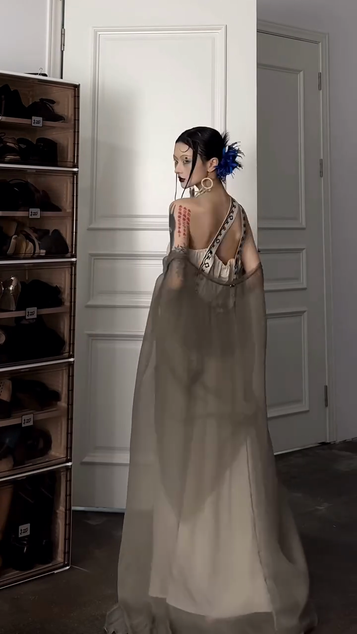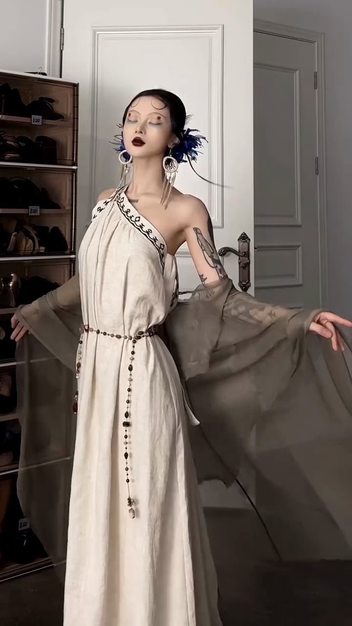Asymmetric Embroidered Linen Long-Sleeved Maxi Dress