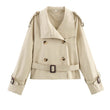 This beige cropped trench coat features a classic double-breasted design for a refined and elegant look. A high stand-up collar and epaulettes add a touch of elegance. The wide belt with a buckle accentuates the hourglass silhouette. The cropped length makes it a stylish choice for pairing with high-waisted pants, like these dark jeans. It's perfect for transitioning between seasons and effortlessly transitions between formal and formal occasions. Complete the look with a stylish handbag and plush gloves (as shown). Whether you're heading to a casual brunch or heading out for a day on the town, this trench coat is a stylish outerwear choice.