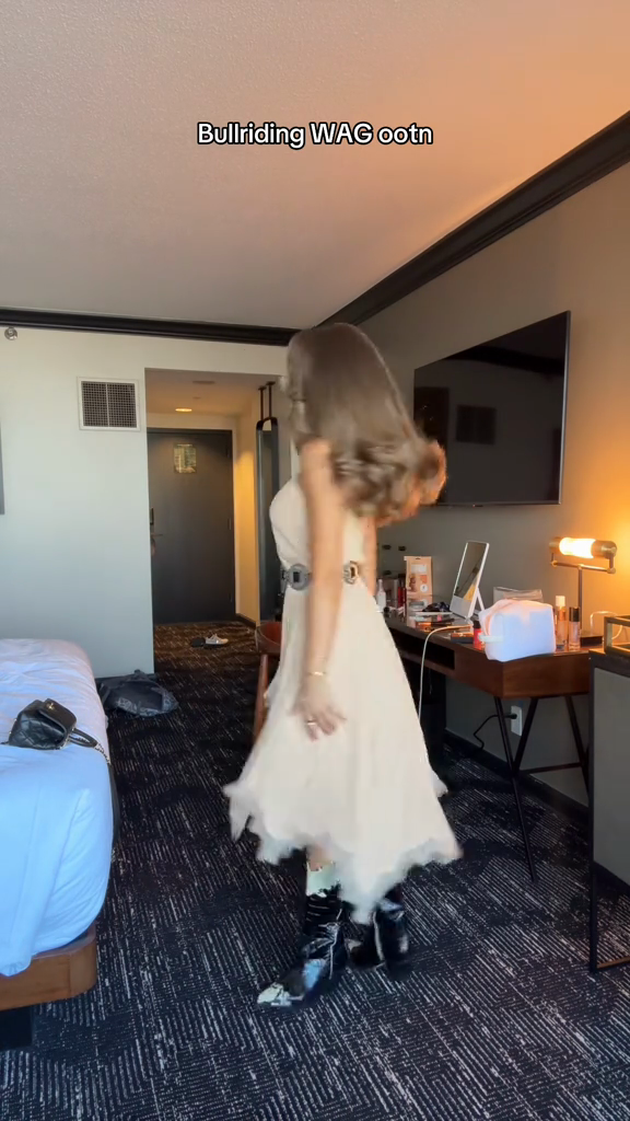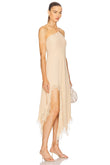 This is a beige halter midi dress featuring lace trim along the neckline and the asymmetric hemline. The dress has thin, criss - cross halter straps and a flowing silhouette. The woman wearing the dress pairs it with strappy beige sandals and a small, beige, ruched clutch, creating an elegant and cohesive look suitable for events like garden parties, weddings, or semi - formal gatherings.
