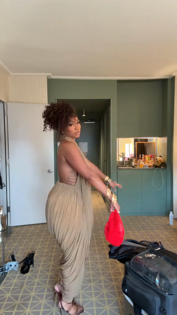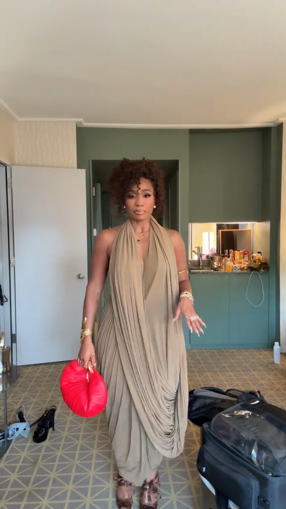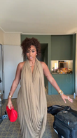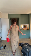 This beige, backless maxi dress features a stunning drape for a fluid and elegant look. The halter neckline flatters the shoulders for added appeal. The loose, flowing fabric flatters all body shapes, creating a comfortable and stylish look. It's perfect for formal events, evening parties, or any occasion where you want to exude elegance. As shown, pair it with a bright red bag for a striking contrast. Complete the look with gold jewelry and stylish sandals.