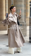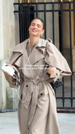 This beige trench coat features an oversized silhouette for effortless chic. Classic details like a high stand-up collar, double-breasted design, and a belt add a touch of elegance to this traditional trench coat. Perfect for seasons, it effortlessly complements any outfit, from casual to semi-formal. The woman in the photo accessorizes this simple look with a black handbag, adding a touch of sophistication. Made from durable fabric, this trench coat is comfortable and weatherproof, making it an ideal choice for city strolls, work, or travel. Its loose fit allows for layering, making it a practical and stylish addition to your wardrobe.
