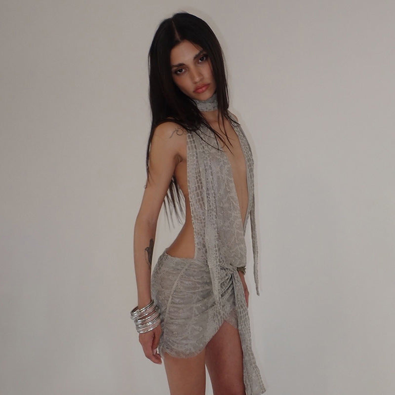 This beige mini dress, embellished with a bold animal print, exudes a wild and chic vibe. Its halter neckline and plunging V-neck create a flattering and sensual silhouette, perfect for parties or special occasions. The lace-up design and flowing fabric details add a touch of drama and movement. Accessorize with gold accessories, such as the bracelet and starfish-shaped watch shown. It's perfect for a night out, a beach party, or any occasion where you want to stand out. The cropped silhouette and bold design make it a striking choice for those seeking a bold style.