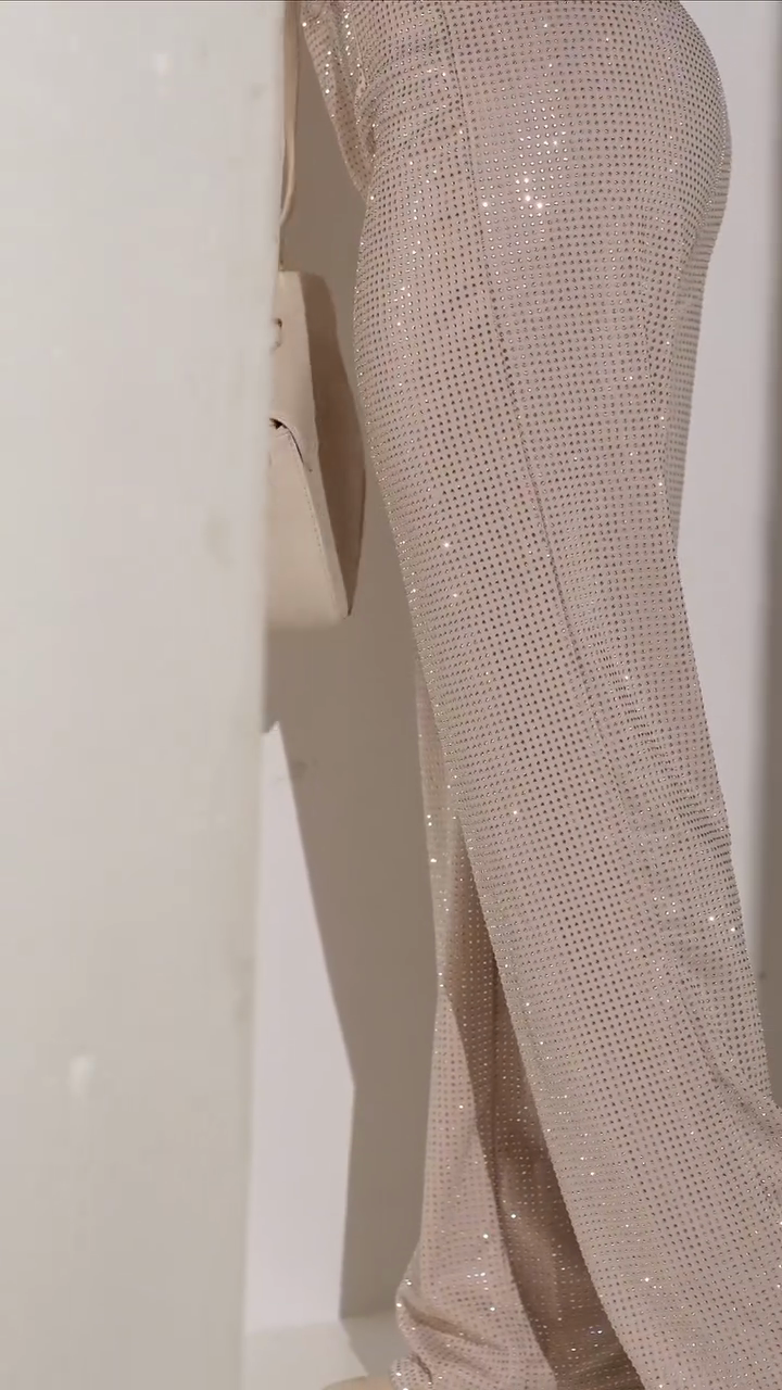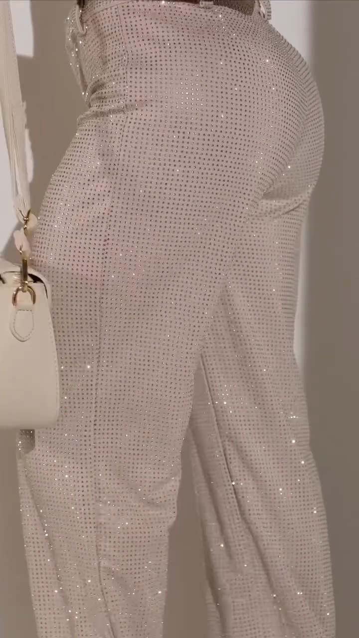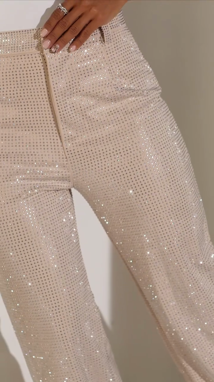 Beige Rhinestone - Embellished Wide - Leg Pants