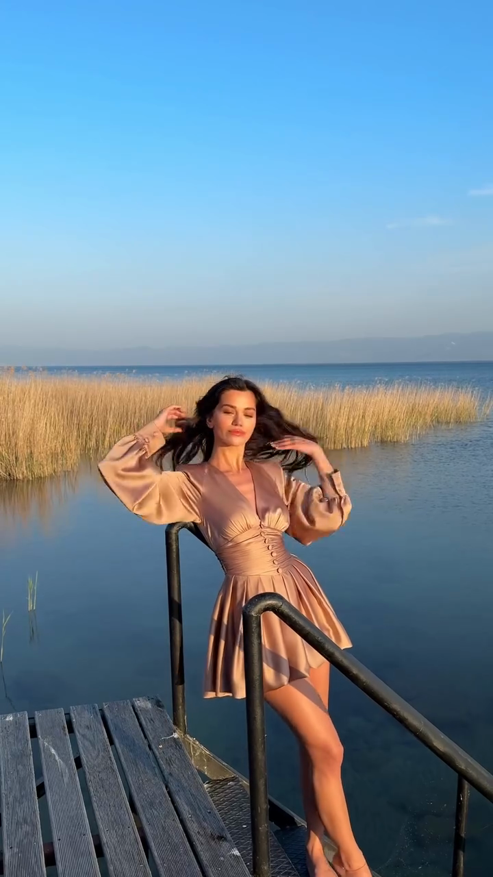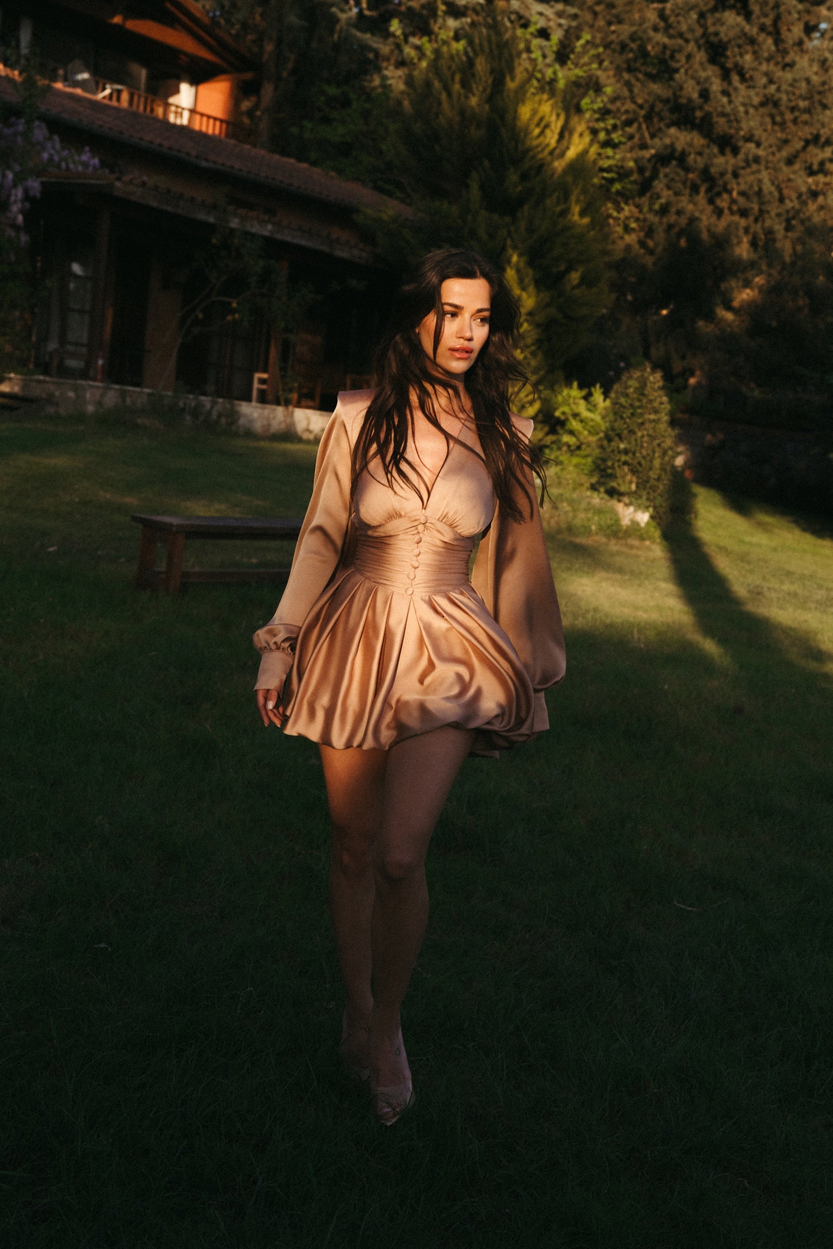 Beige Satin Deep V - Neck Dress