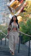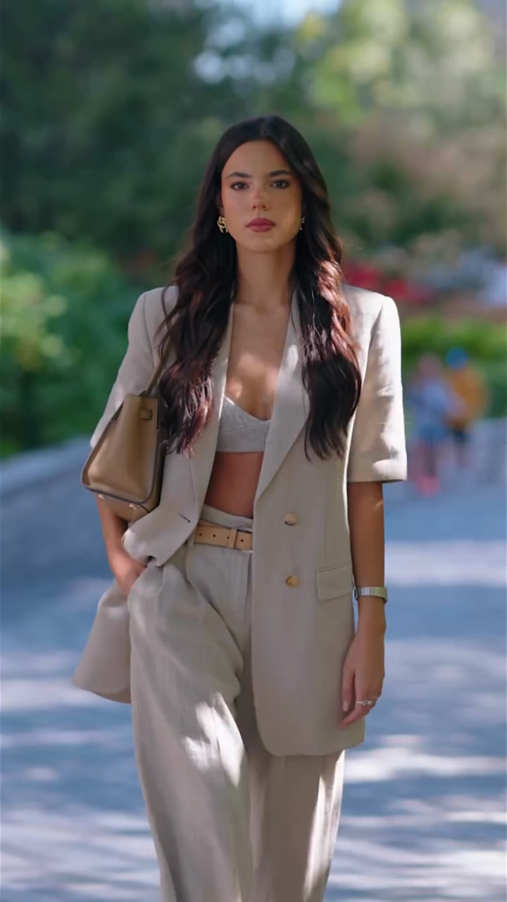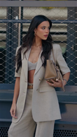 This stylish beige three-piece suit consists of a short-sleeved blazer, a cropped knit top, and wide-leg trousers. The blazer's relaxed cut adds a casual edge to the formal look. The cropped top adds a touch of modern sexiness without sacrificing feminine elegance. This outfit is perfect for urban commuting or semi-formal occasions, creating a look that's both professional and stylish.