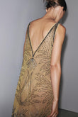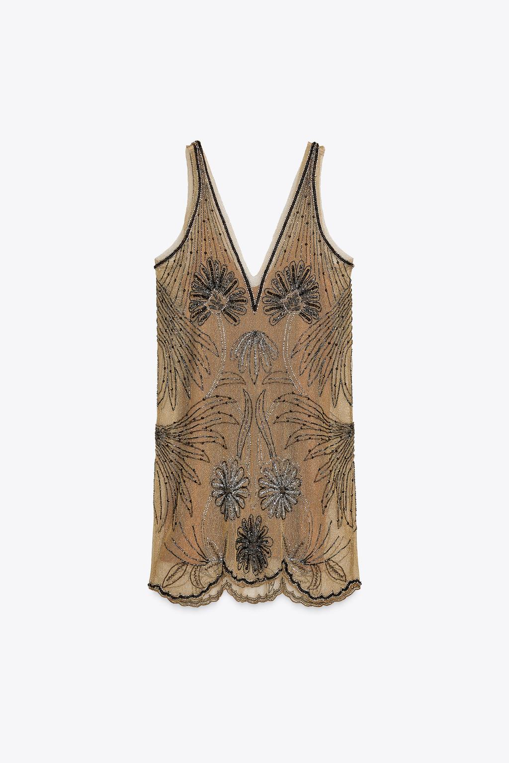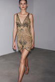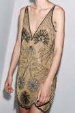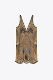 Beige V Neck Beaded Floral Mini Dress