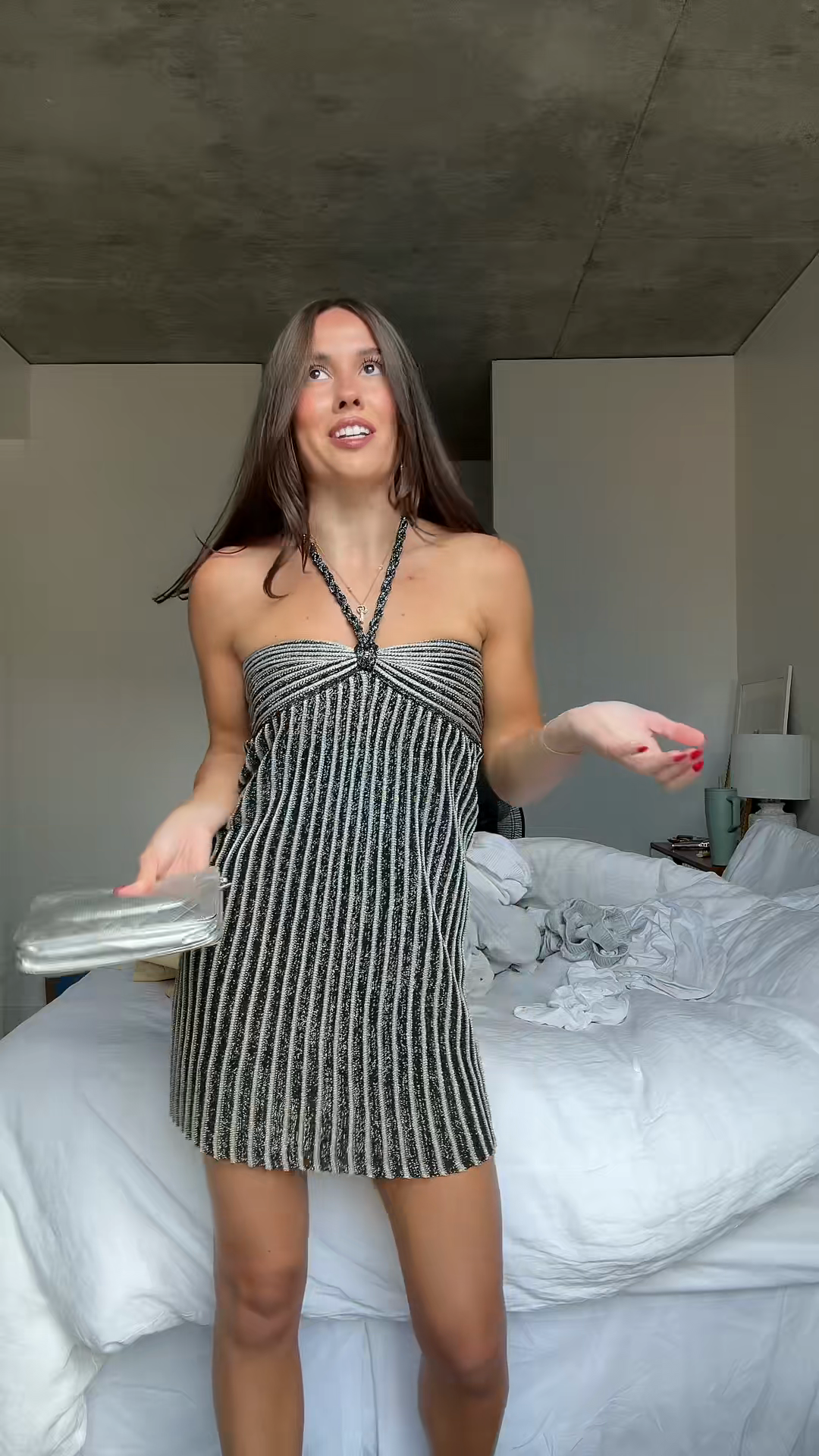 Black and Silver Striped Halter Mini Dress