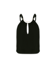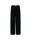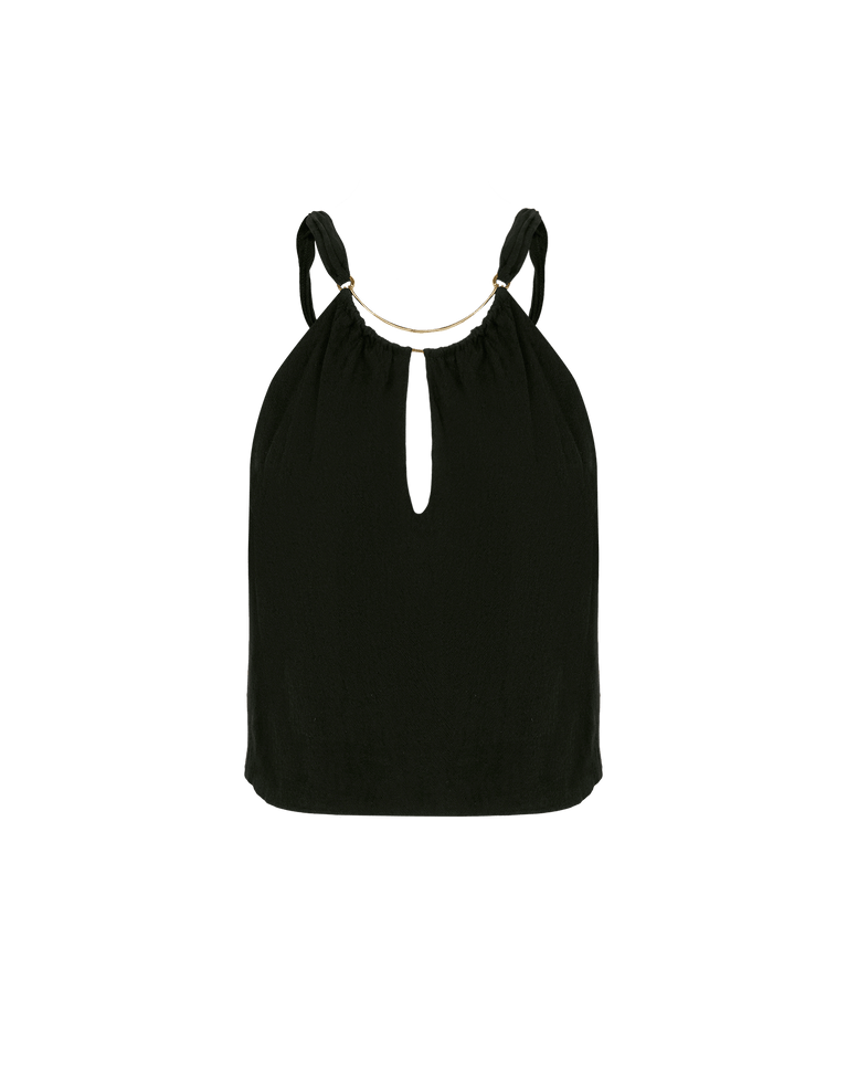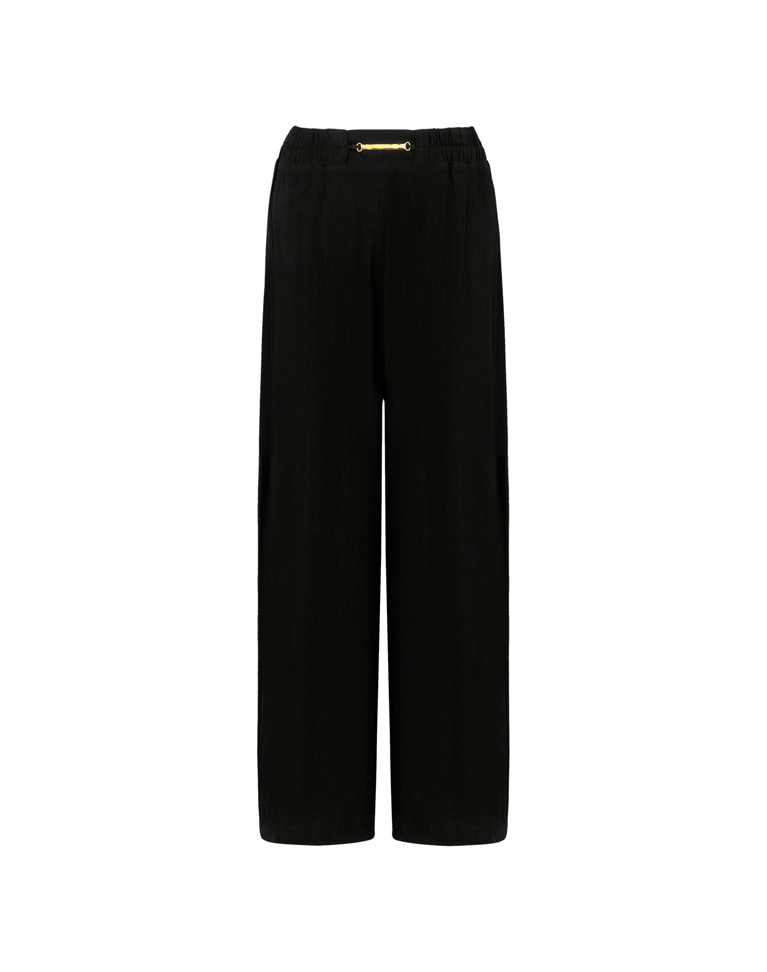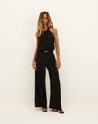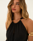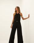Black Halterneck Jumpsuit with Gold Accents wide - leg pants and a sleek, minimalist design. Gold accents are present, including a gold bracelet on the arm and what appears to be a small gold detail on the waistband. Paired with black thong sandals, this outfit is suitable for casual outings, evening events, or social gatherings, offering a combination of elegance and simplicity.