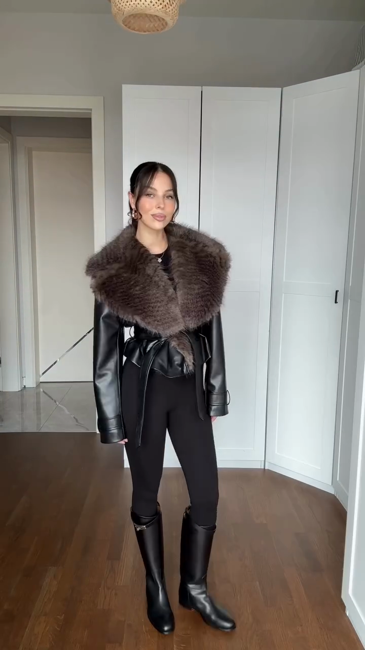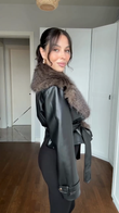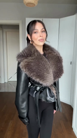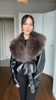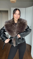 This stylish black leather jacket features a wide, plush, warm brown faux fur collar for a luxurious touch. A belted design cinches the waist for a more fitted silhouette. Crafted from smooth leather, it offers a sleek, sophisticated look. Perfect for cooler weather, this jacket seamlessly blends the edgy style of leather with the comfort of fur, perfect for both casual and slightly more formal looks.