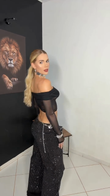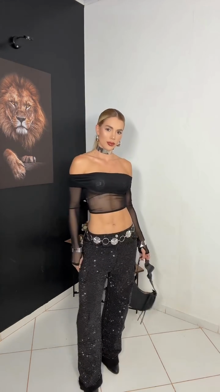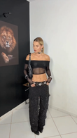 Black Off - Shoulder Sheer Crop Top & Rhinestone Cargo Pants Set