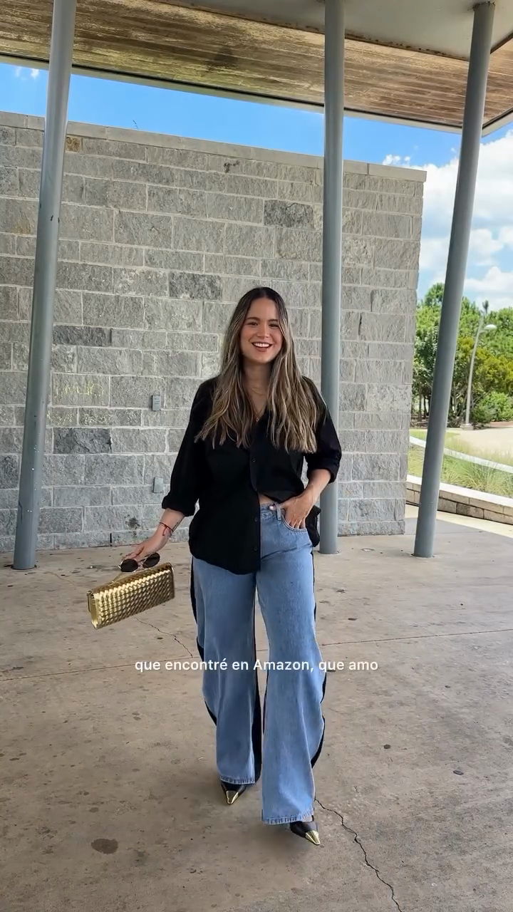 Black Oversized Shirt & Contrast - Trimmed Wide - Leg Jeans Set