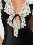 This is a black satin midi dress featuring a deep V - neckline adorned with white lace detailing. There's a small tie at the neck that adds a delicate touch. The dress has a form - fitting silhouette that accentuates the figure. The woman wearing the dress pairs it with black pointed - toe mules and gold bangles, creating an elegant and sophisticated look suitable for evening events like dinner parties or cocktail gatherings.