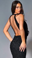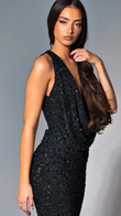 This black sequined gown features a dramatic plunging neckline (a deep, flattering neckline) and a flattering silhouette. Made from stretch fabric and embellished with sequins, it creates a shimmering, sleek, and comfortable look. Perfect for formal evening events like red carpets and galas, it's perfect for a chic look with minimal jewelry.