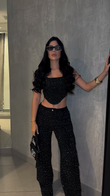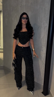 This two-piece set features a black base embellished with shimmering sequins for a dazzling look. The cropped top's unique asymmetrical hem adds a stylish touch, while the high-waisted, wide-leg pants flatter the figure. The slim-fitting top accentuates curves, while the loose-fitting pants mitigate the revealing feel of the top. Perfect for a night out, a party, or any special occasion where you want to make a statement, this set is perfect. As shown, pair it perfectly with silver pointed-toe heels for an extra touch of glamour. Accessorize with simple, sparkling jewelry and a stylish handbag for even more flair.