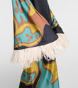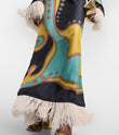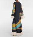 Black Silk Maxi Dress with Colorful Print and Feather Trim