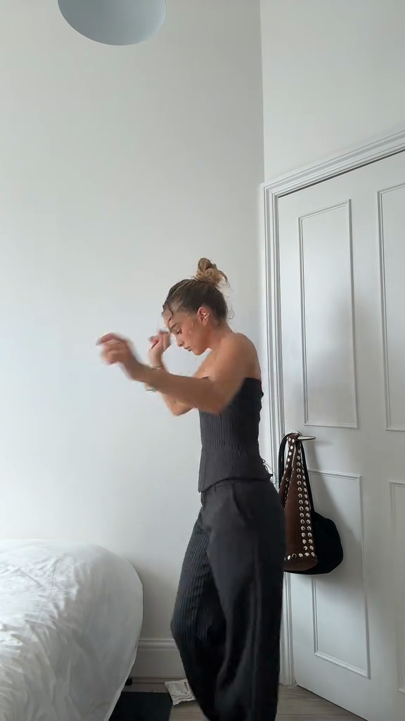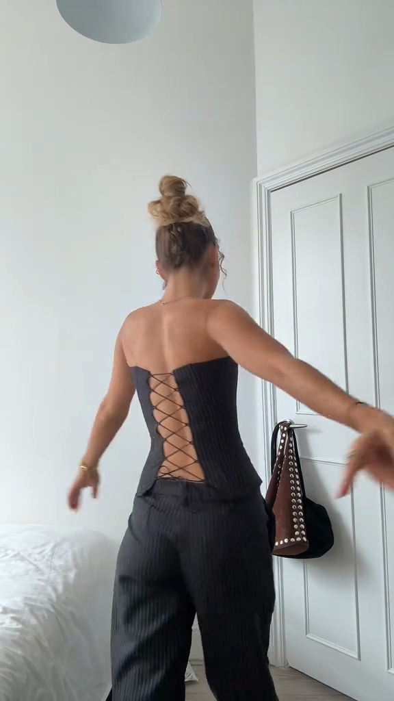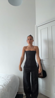 Black Striped Strapless Jumpsuit Outfit.The jumpsuit features a fitted bodice and wide - leg pants. They are accessorized with delicate gold necklaces and are holding a brown handbag with studded details. This outfit exudes a sleek, modern, and minimalist style, suitable for casual outings or semi - formal events in an urban setting.