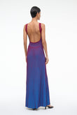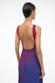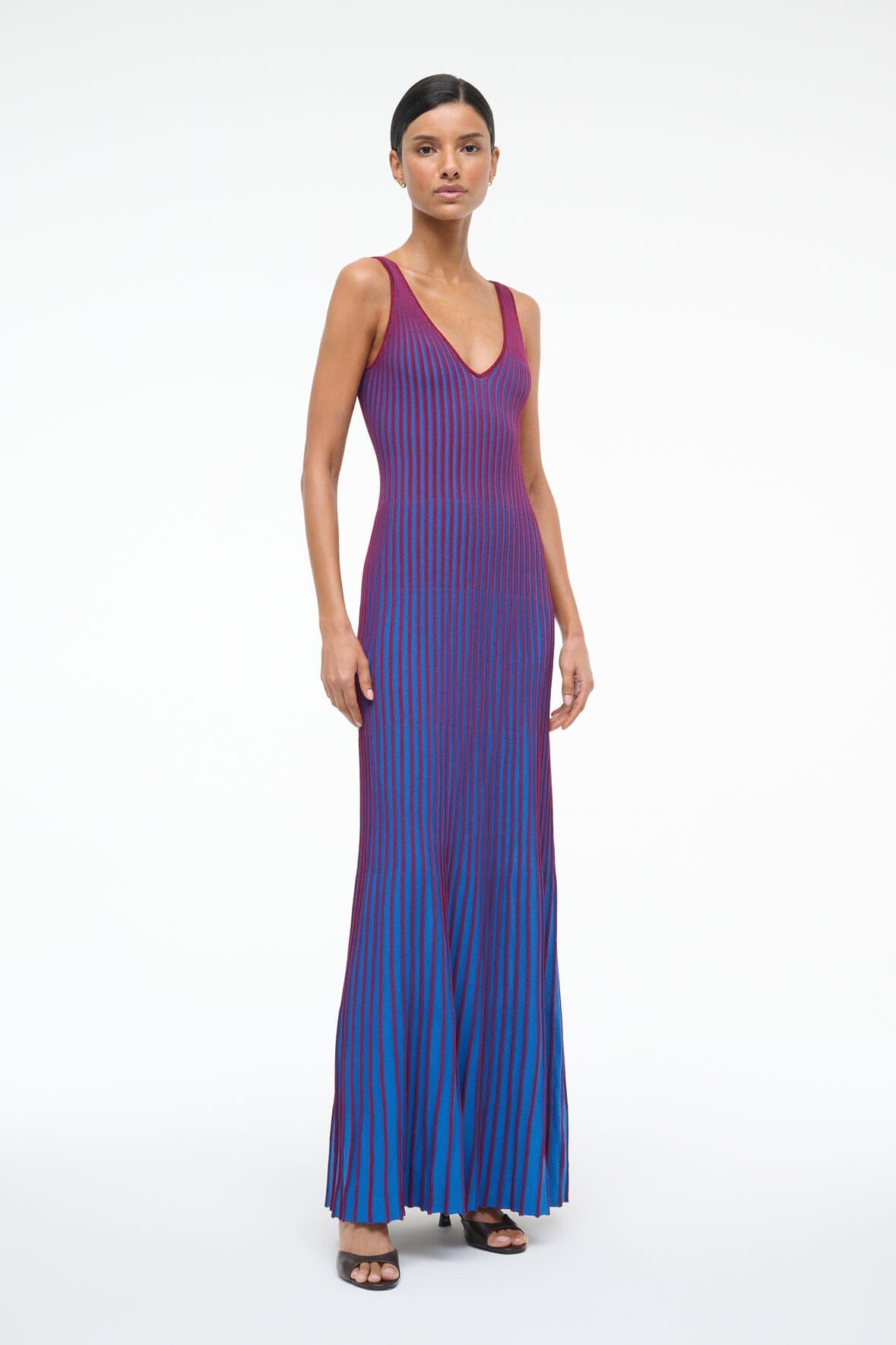 This is a sleeveless maxi dress featuring a vertical stripe pattern in blue and red. The dress has a deep V - neckline and a form - fitting, ribbed knit design that flows down to the ankles. The woman wearing the dress pairs it with black flat sandals and a small, dark - colored handbag with a gold ring detail. This outfit offers a sleek, elegant look, suitable for various occasions from casual outings to more formal events.