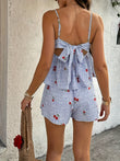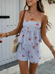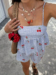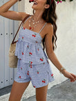 This two-piece set features a classic blue and white check pattern accented with a lovely cherry print, exuding a sweet summer vibe. The camisole's ruffled hem adds a touch of femininity, while the matching shorts have a loose fit for comfort. Made from lightweight, breathable fabric, it's perfect for warm weather. Whether you're heading to a picnic, a beach vacation, or just relaxing out and about, this set will keep you comfortable and stylish. Wear it on its own for a coordinated look, or mix and match the top or shorts with other pieces in your wardrobe. For example, pair the top with jeans and the shorts with a solid tank top for a different look.