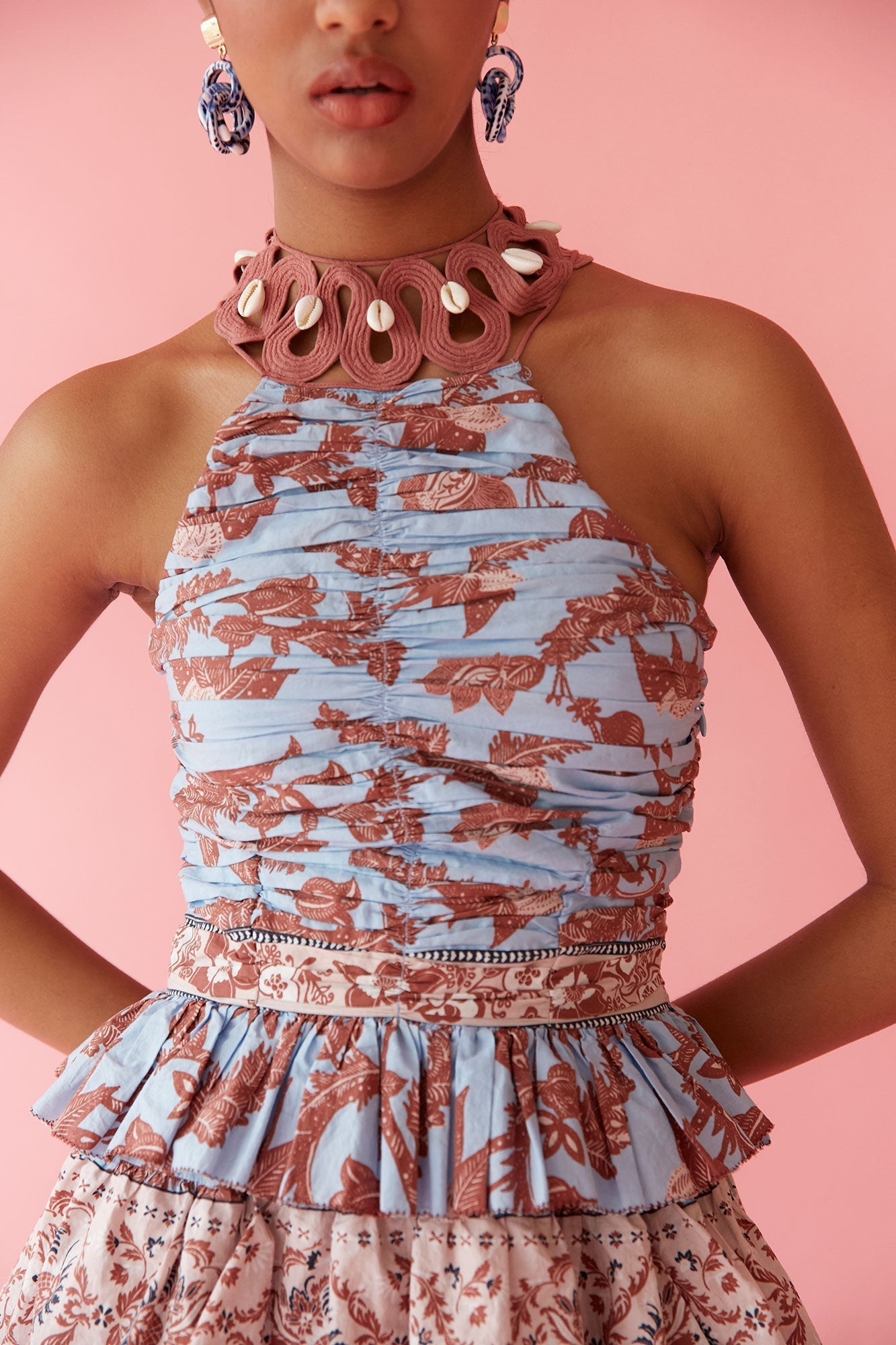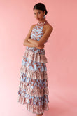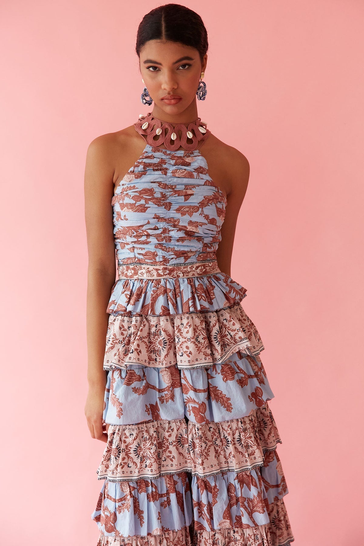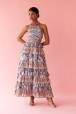 Blue & Brown Floral Print Tiered Halter Maxi Dress
