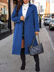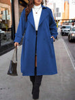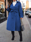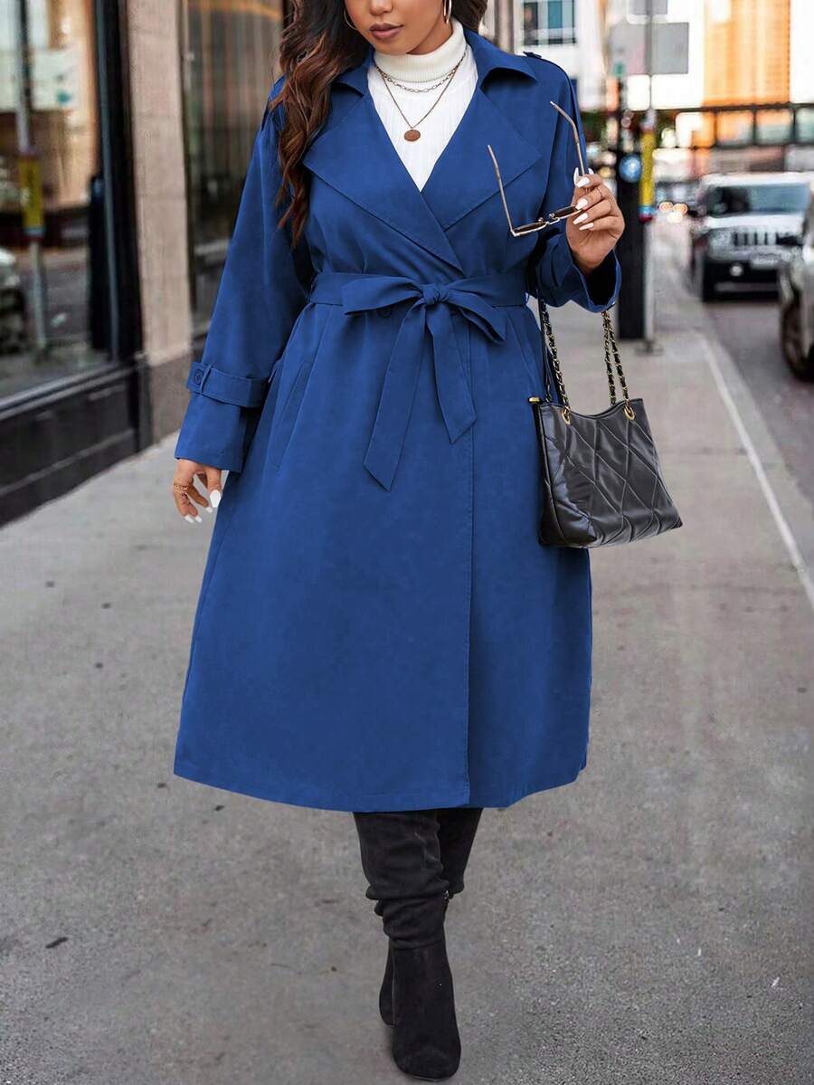 Blue Double - Breasted Trench Coat ,underneath, they have a white turtleneck top paired with a short skirt that's partially visible. The outfit is accessorized with a necklace, large hoop earrings, and a black handbag with a chain - strap. Completing the look are black over - the - knee boots. This ensemble is suitable for urban settings during transitional seasons like spring or fall, combining both style and functionality.