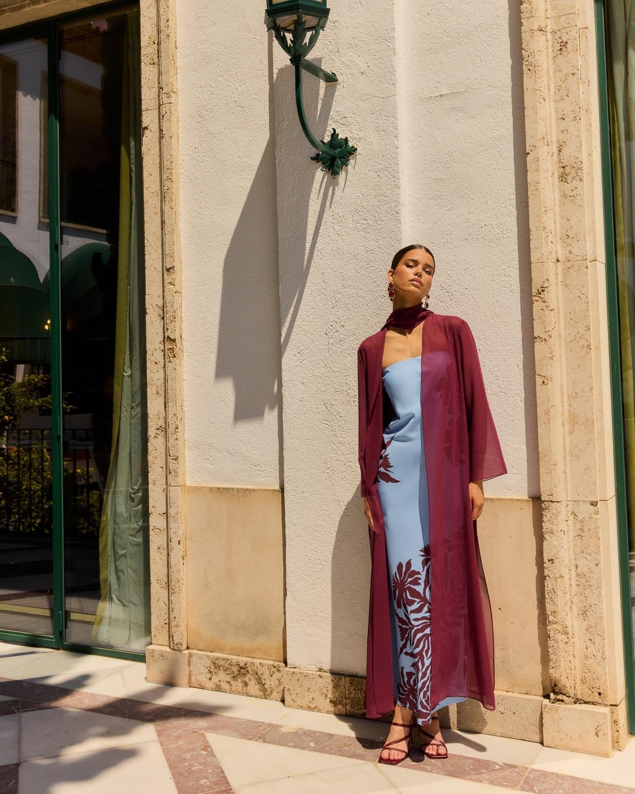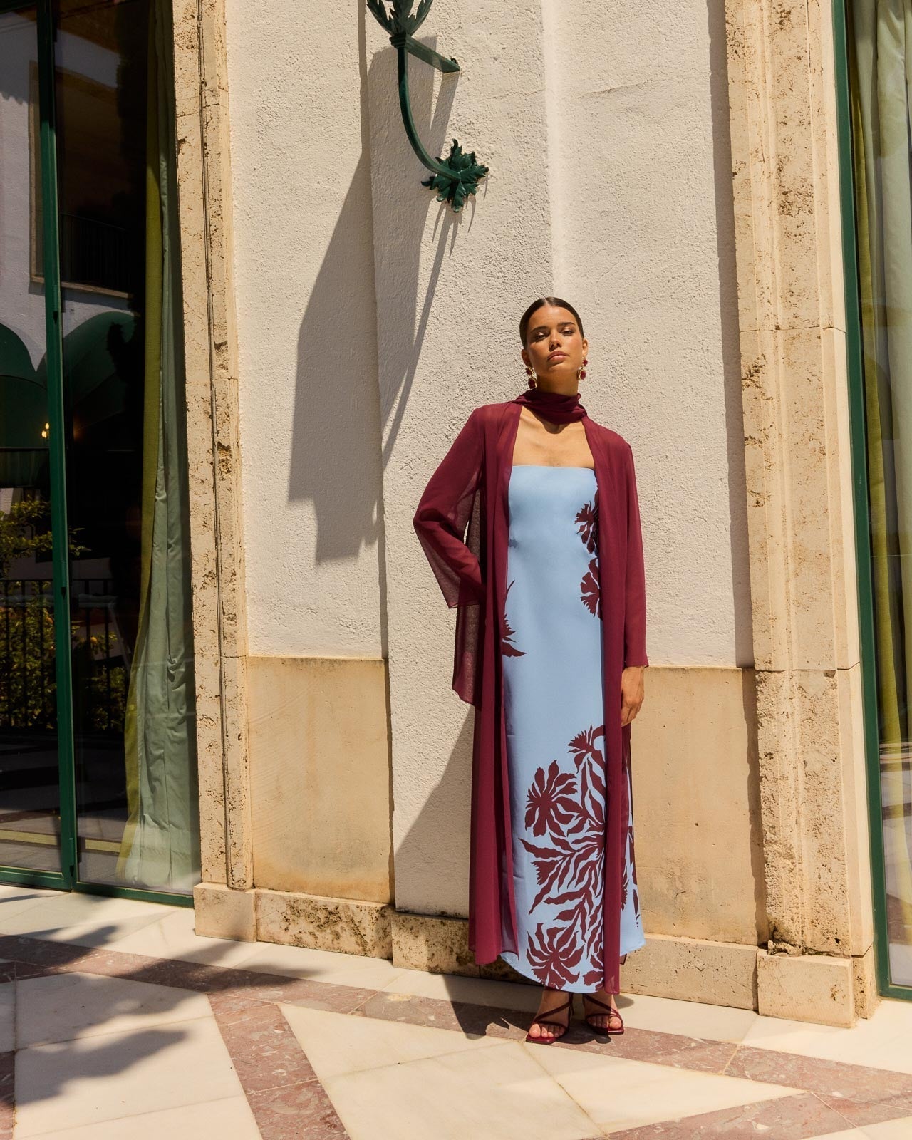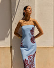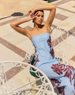 Blue Floral Print Strapless Maxi Dress and Burgundy Robe Set