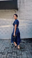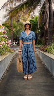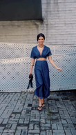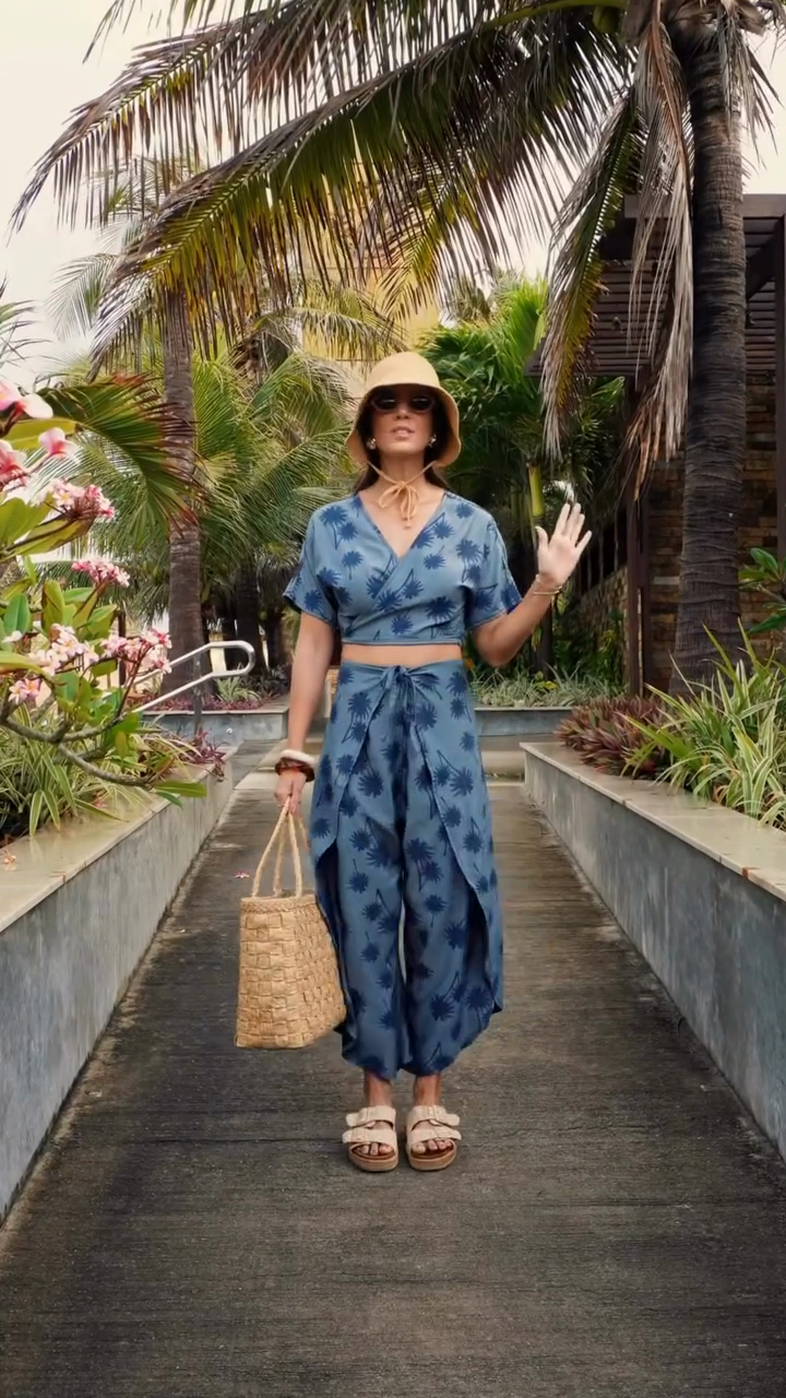 This outfit consists of a blue wrap - style crop top and matching high - waisted wide - leg pants, both featuring a floral pattern. Paired with a straw bucket hat, sunglasses, and carrying a woven straw tote bag, along with wearing platform sandals, it creates a relaxed, summery look perfect for a tropical or beachside environment, suitable for casual outings, beach walks, or resort - style activities.