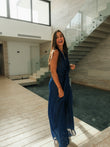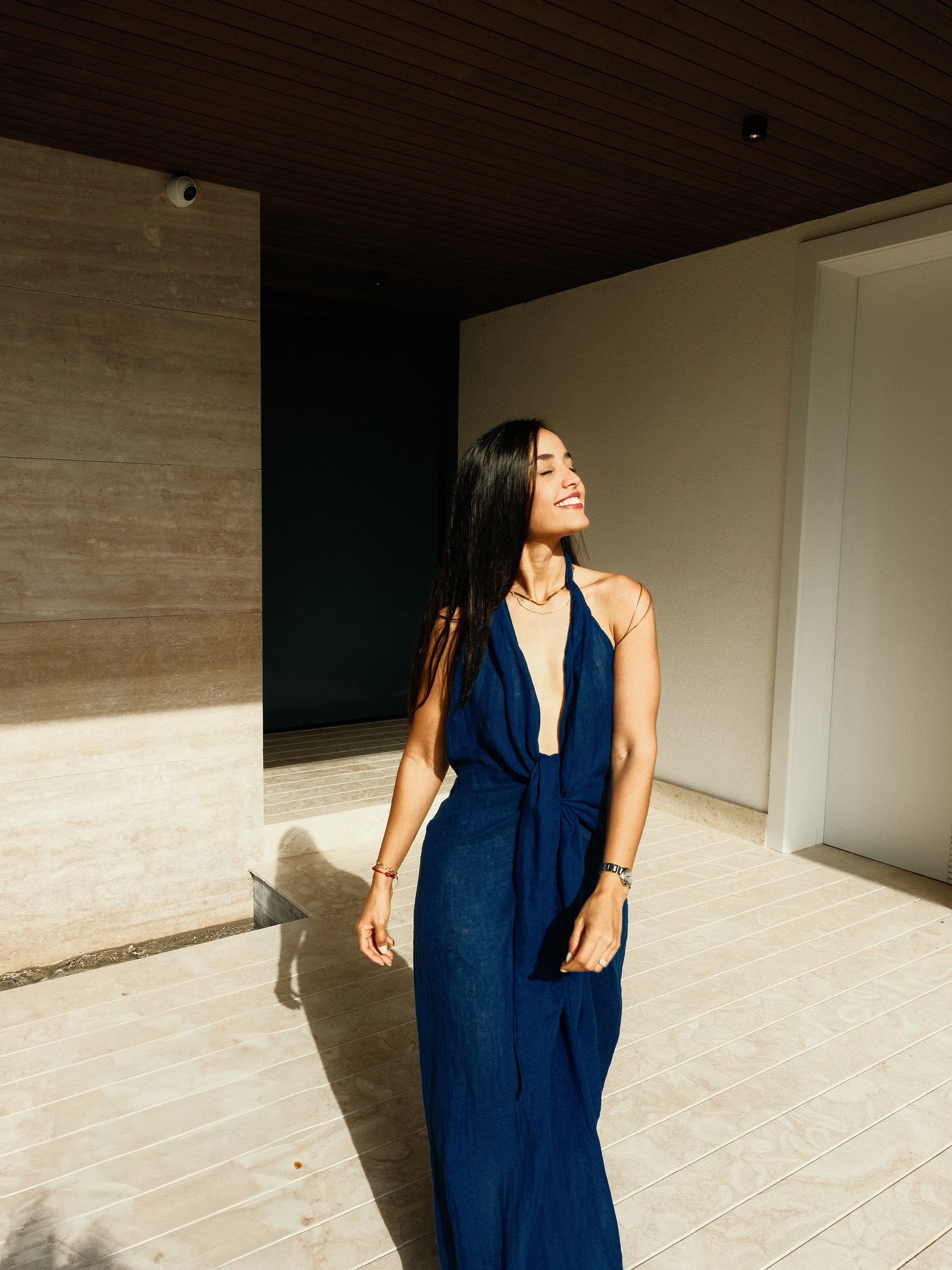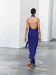 This royal blue maxi dress, featuring an open back and a plunging V-neck, exudes allure and sophistication. The fabric ties at the front, creating a unique and flattering detail that accentuates the figure.