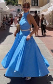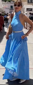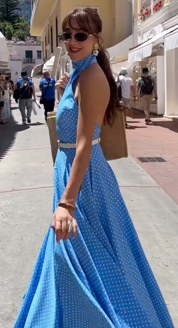 Blue Polka Dot Halter Neck Maxi Dress