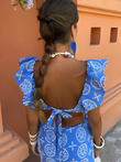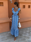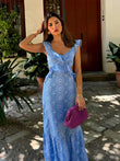 Blue Printed Ruffle - Sleeve Maxi Dress