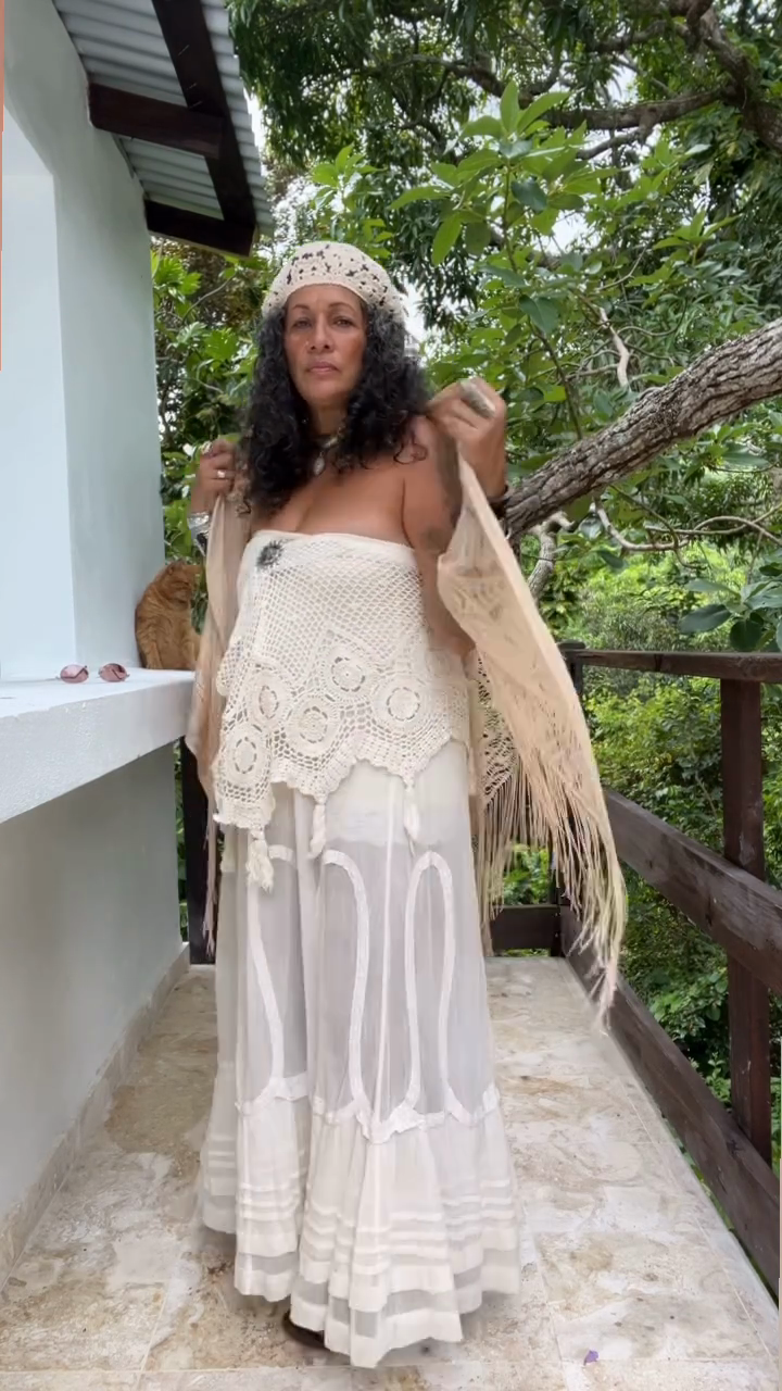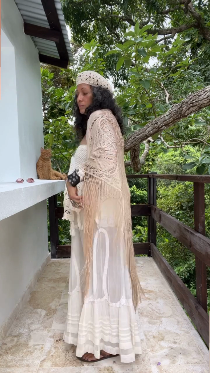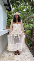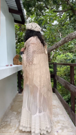 Bohemian White Crochet Top with Sheer Maxi Skirt and Fringed Shawl