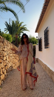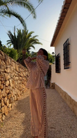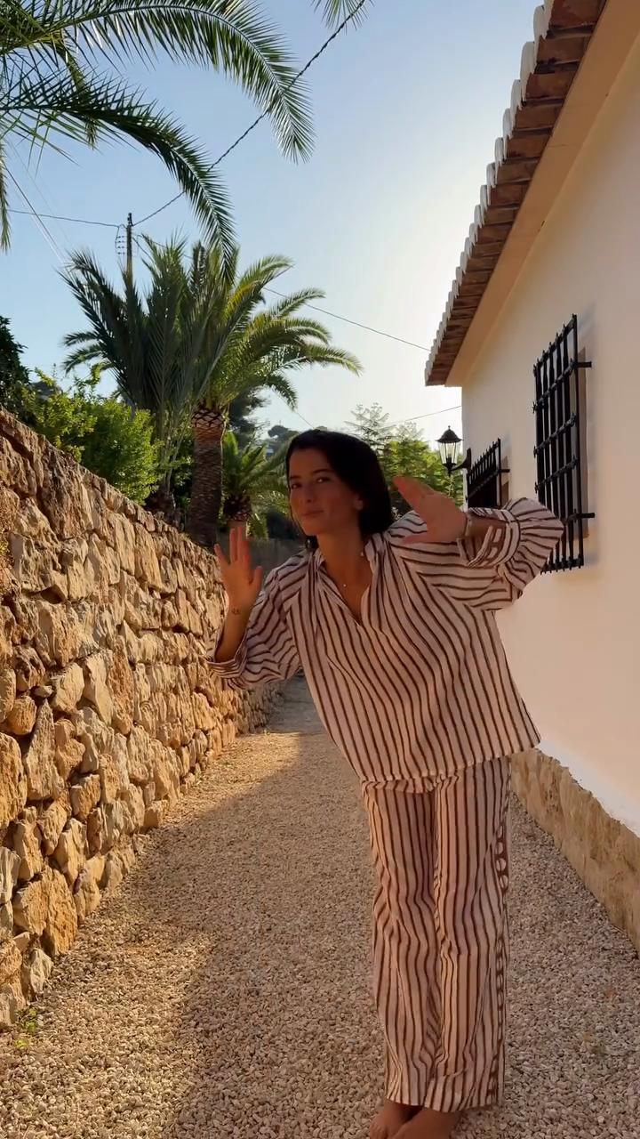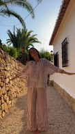 This outfit consists of a loose - fitting, long - sleeved top and matching wide - leg pants, both featuring brown and white vertical stripes. The top has a V - neck design, and the set appears to be made of a comfortable, breathable fabric, ideal for loungewear. The relaxed silhouette and neutral color scheme create a casual and laid - back look, perfect for a leisurely day at home or a relaxed stroll in a warm, sunny environment like the residential area shown in the image, with its stone wall and palm trees.