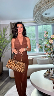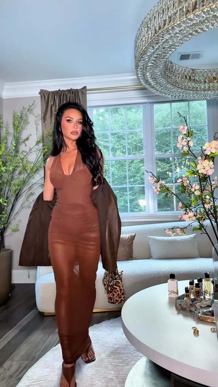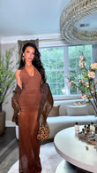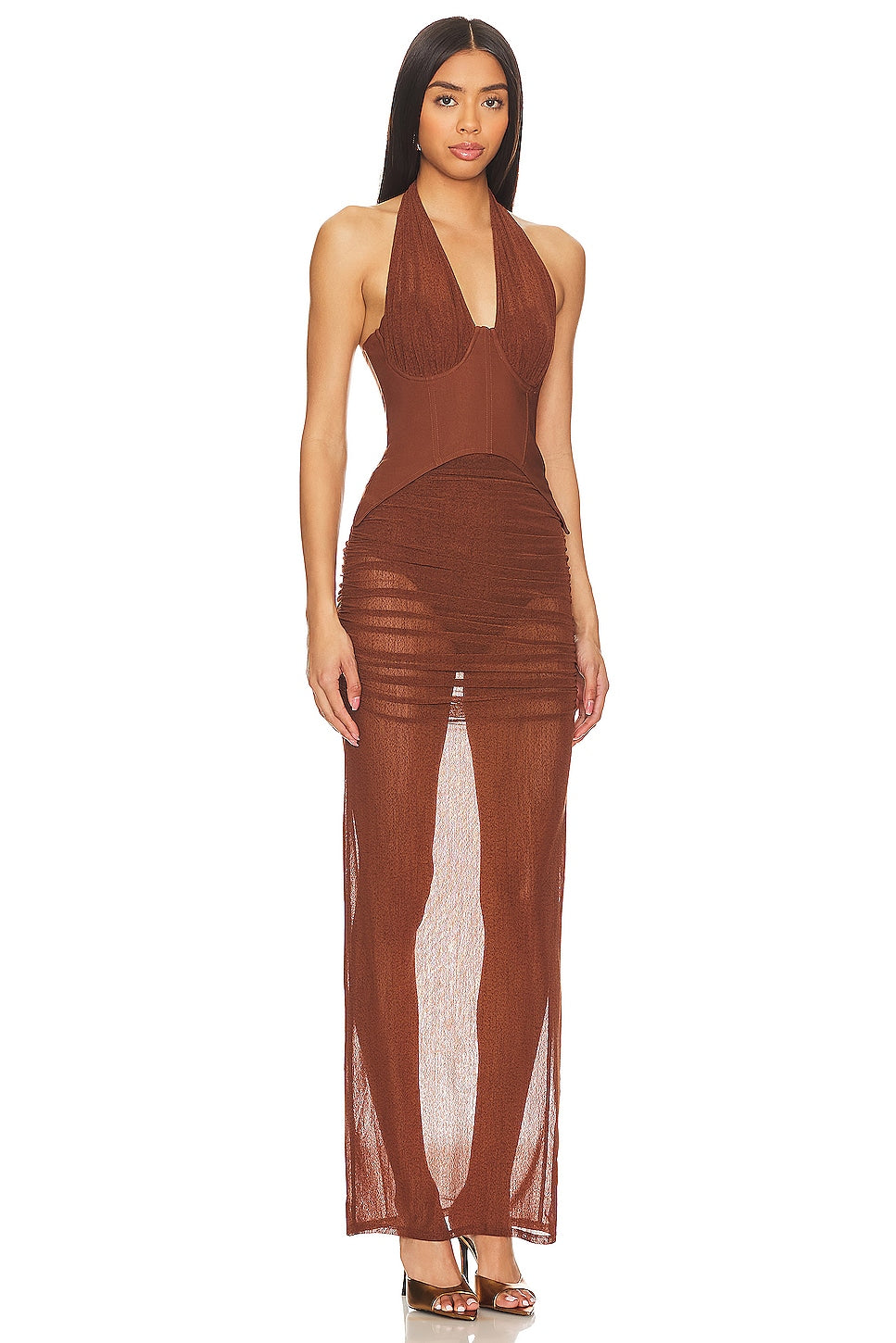 This brown, backless maxi dress features a plunging V-neck and a bustier-style bodice that accentuates the waist. The skirt is crafted from lightweight fabric and embellished with ruching for added glamour and texture. The slim-fitting silhouette creates an elegant and alluring look. Paired with metallic heeled sandals, this dress is perfect for special occasions like parties and formal events, where its unique and stylish design will truly elevate the wearer.