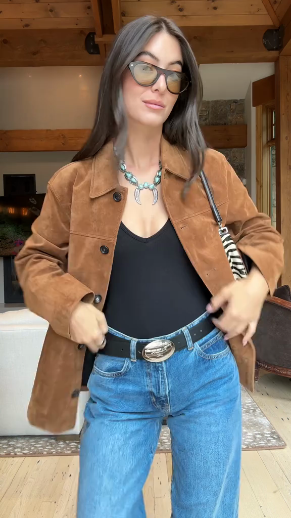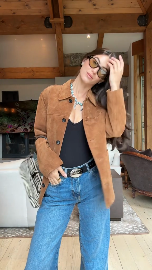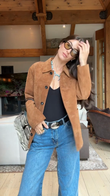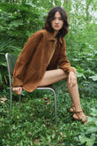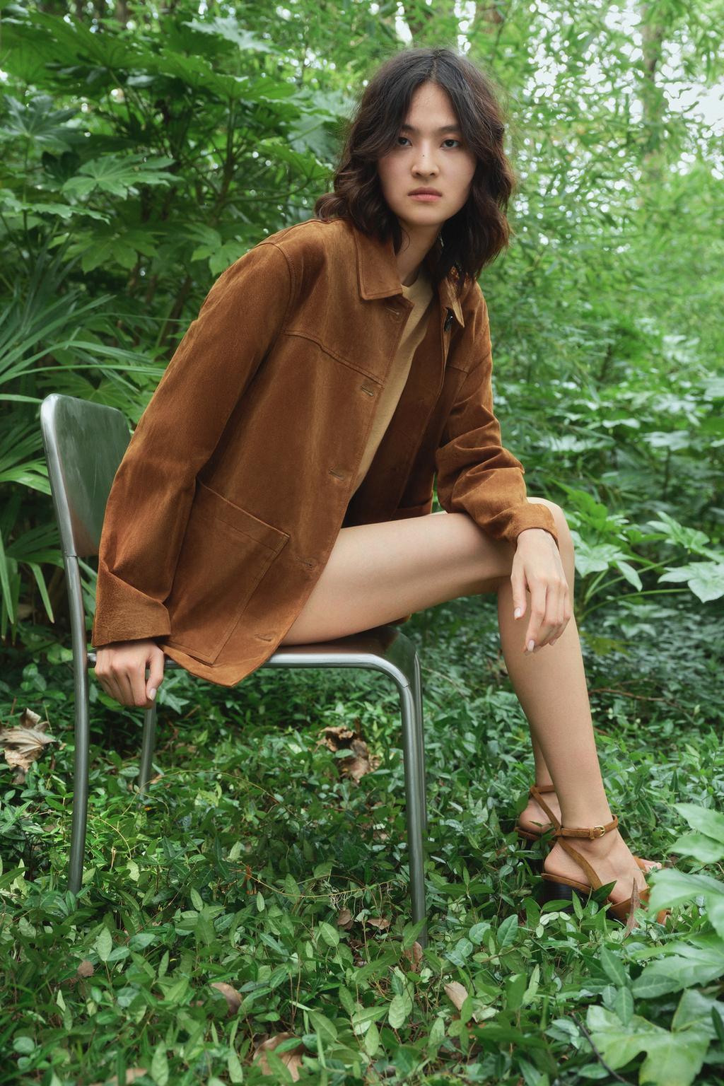 This outfit showcases a brown corduroy jacket, which has a soft texture and a casual, classic design. The jacket features a collared neckline and button - up front, along with front pockets. It's paired with a mustard - colored top underneath, and the look is completed with brown strappy heeled sandals. The natural, lush green surroundings provide a beautiful contrast to the warm tones of the outfit, suggesting a relaxed, earthy style suitable for casual outdoor settings like a garden stroll or a picnic.