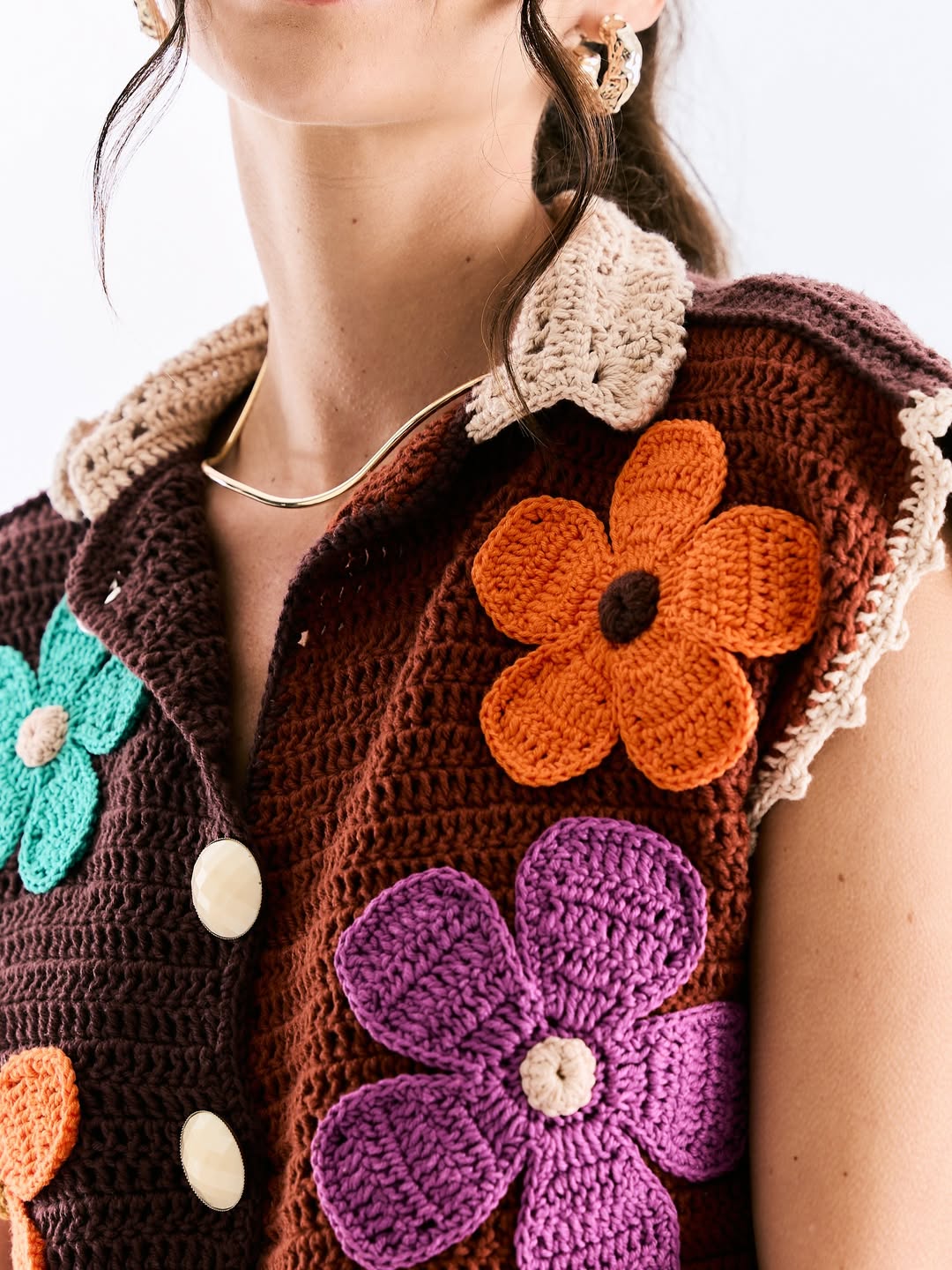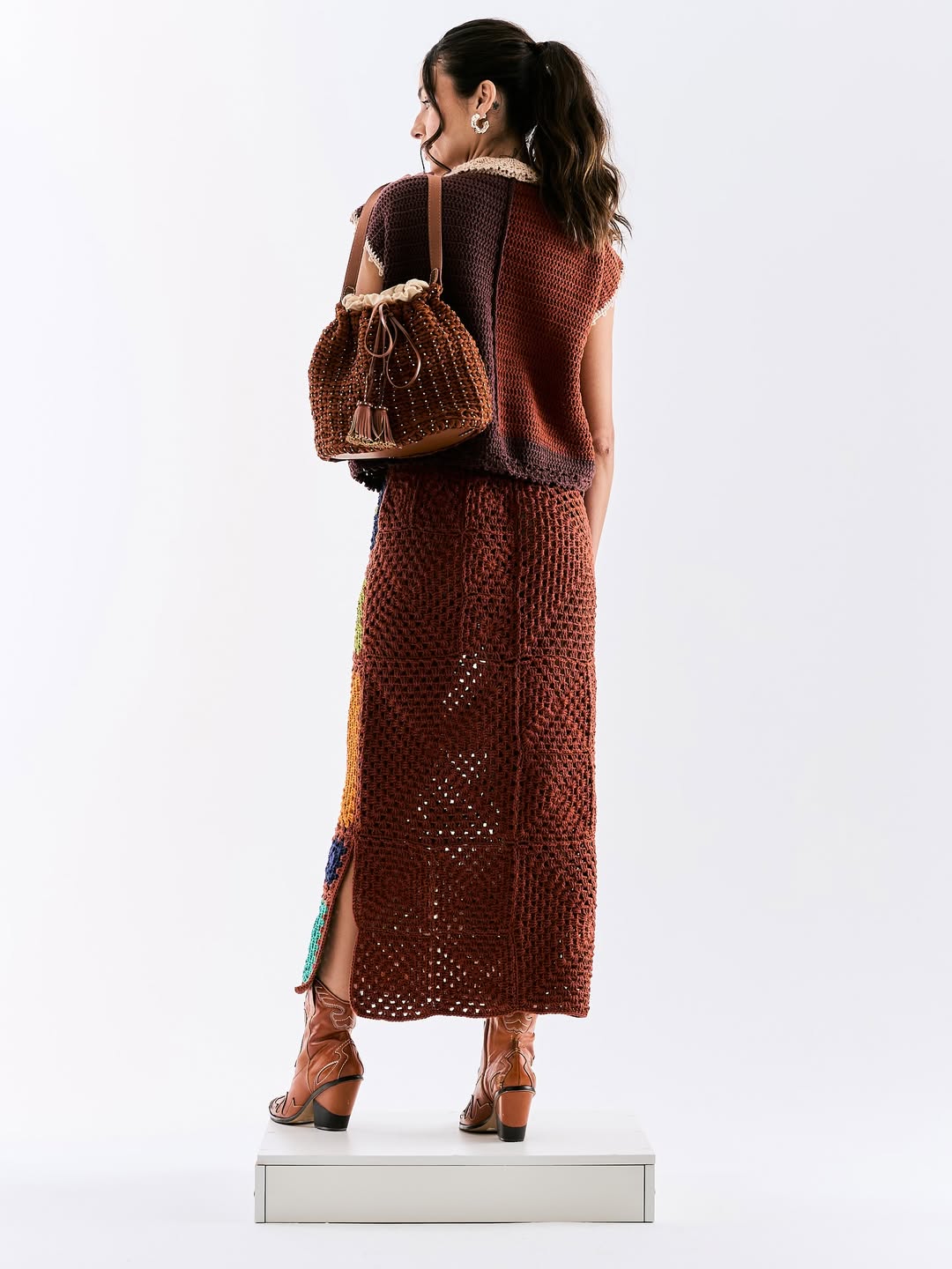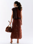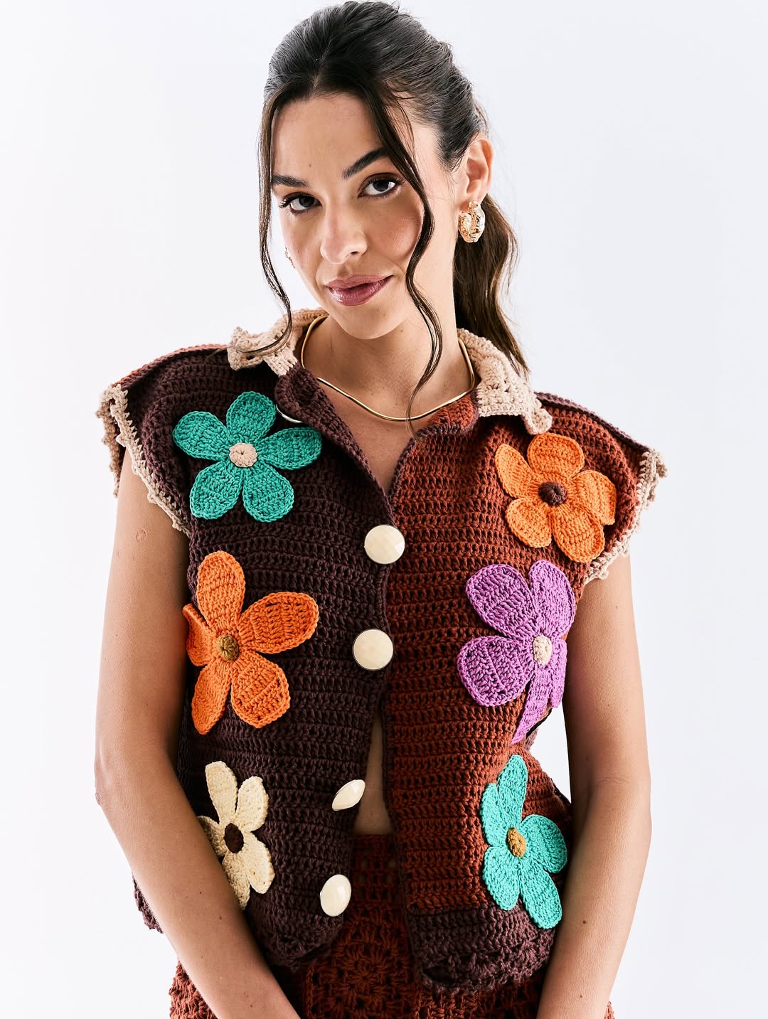 Brown Crochet Vest with Floral Embellishments and Crochet Maxi Skirt Set