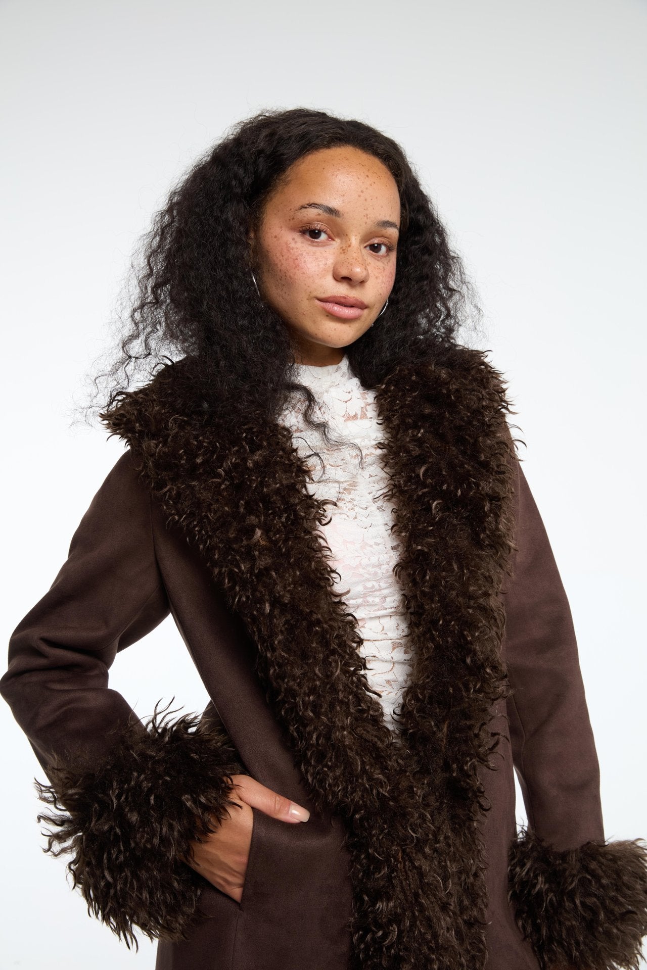 Brown Fur - Trimmed Long Coat with a thick, fluffy fur collar and fur - trimmed cuffs. Underneath the coat, there's a white lace top. This outfit combines warmth and style, suitable for cooler weather. The contrast between the textured fur of the coat and the delicate lace of the top adds visual interest, making it appropriate for casual outings or semi - formal occasions in the fall or winter.