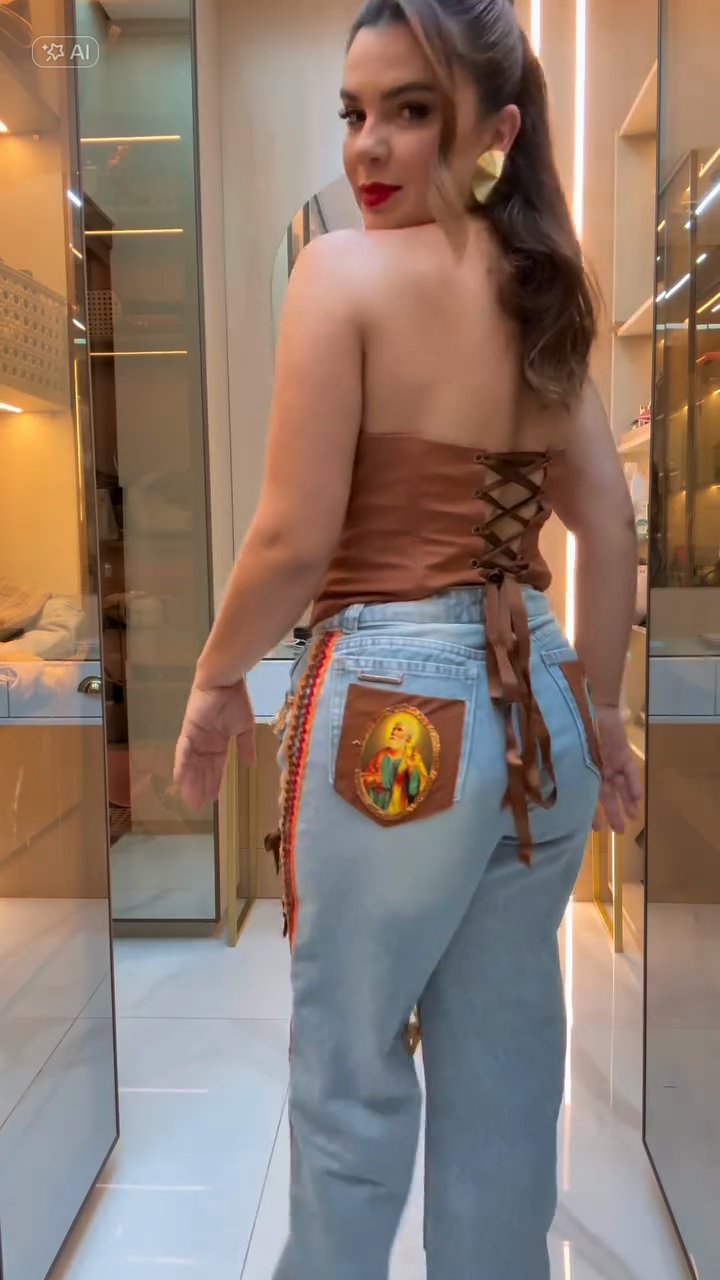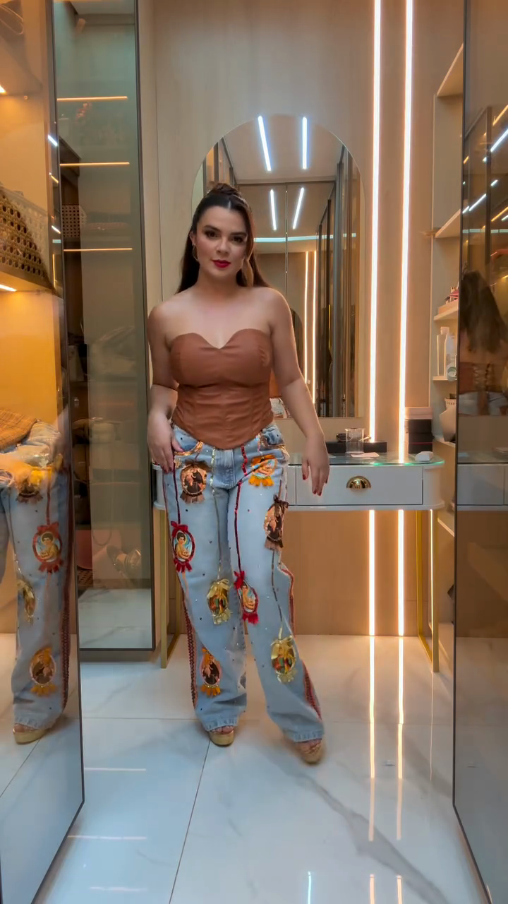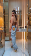 Brown Off-the-shoulder Corset Top Embroidered Denim Wide-leg Pants Set