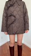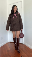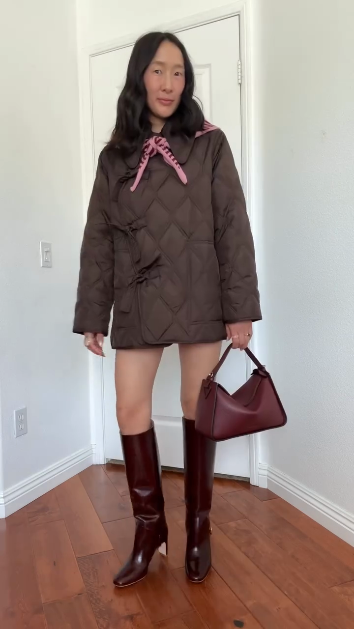 This look features a brown quilted coat with a classic collar and traditional butterfly buttons, exuding a touch of vintage charm. The coat's loose, slightly puffy silhouette is both comfortable and stylish. Paired with a pair of bright brown knee-high boots, the look is refined and harmonious. The warm-toned coat and boots create a harmonious and stylish look, perfect for cooler weather while remaining stylish.