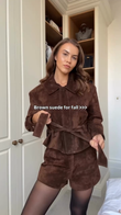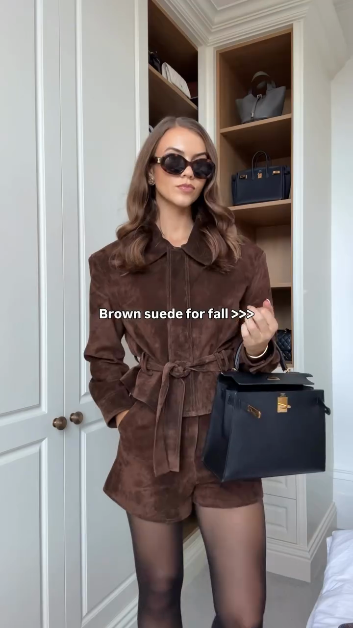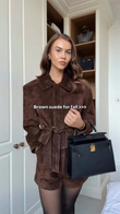 This stylish brown suede suit is perfect for fall. It features a lapel jacket and a belted waistband, creating a flattering silhouette. Pair it with shorts for an even more alluring look. The suede material lends it a soft, luxurious feel, and the warm brown hue is perfect for fall. Paired with sheer black leggings, this outfit is both comfortable and stylish, perfect for a variety of casual or semi-formal fall occasions.