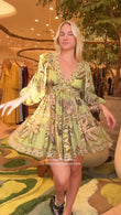 Green Floral - Printed V - Neck Tiered Mini Dress