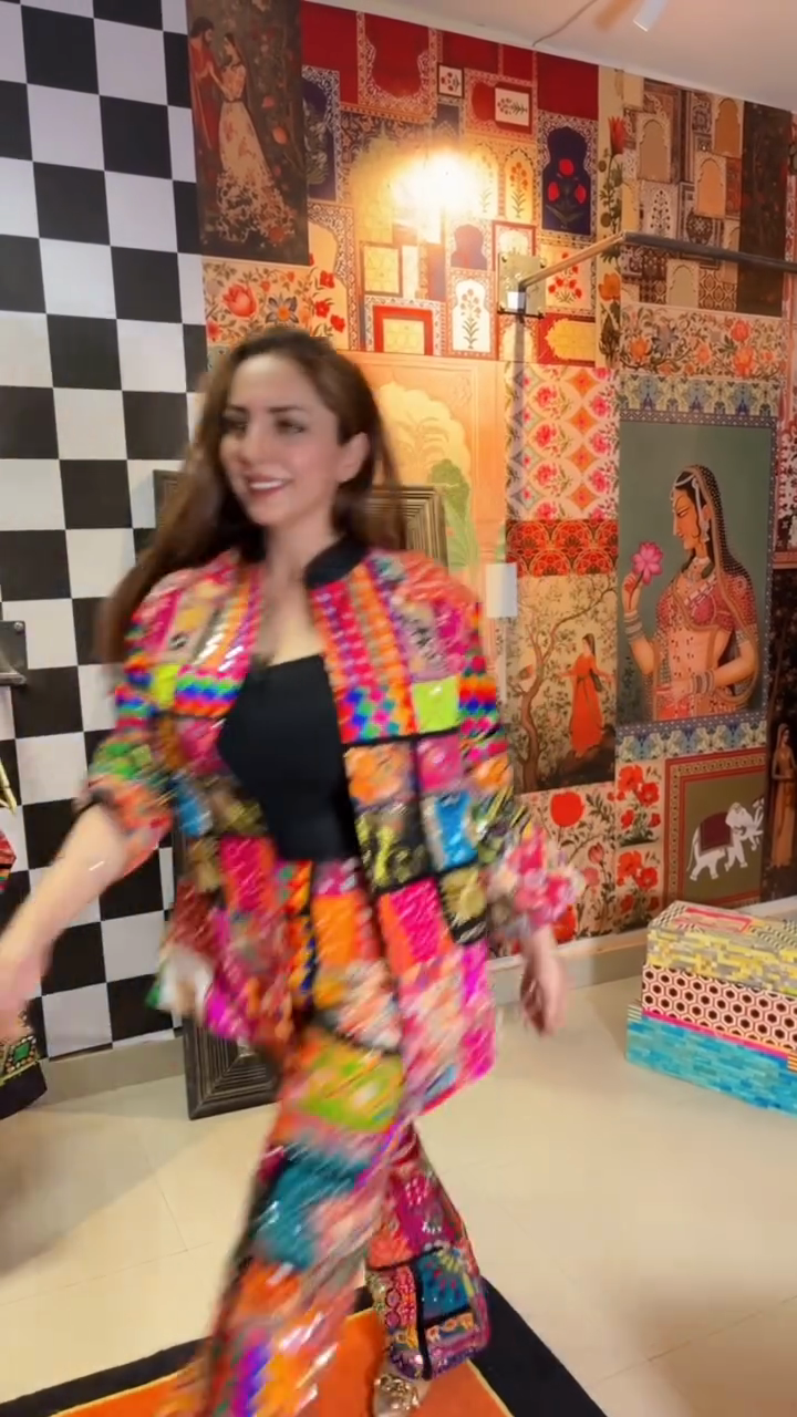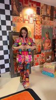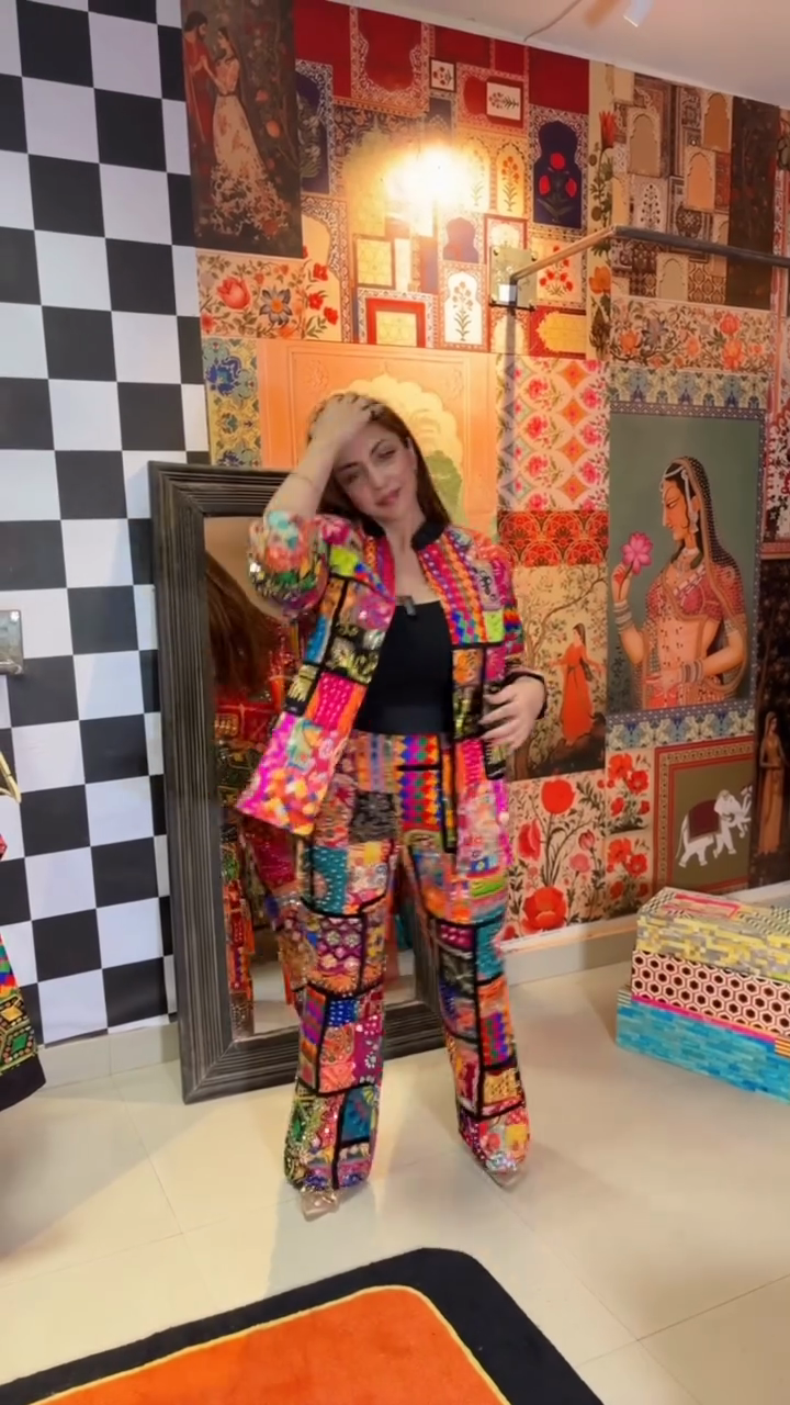 Colorful patchwork jacket and wide-leg pants set