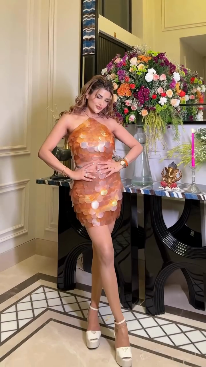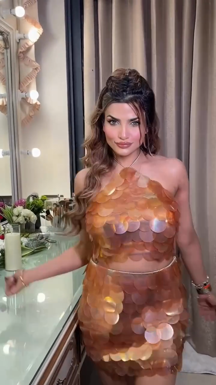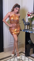 Copper - Toned Sequined Halter Crop Top and Skirt Set