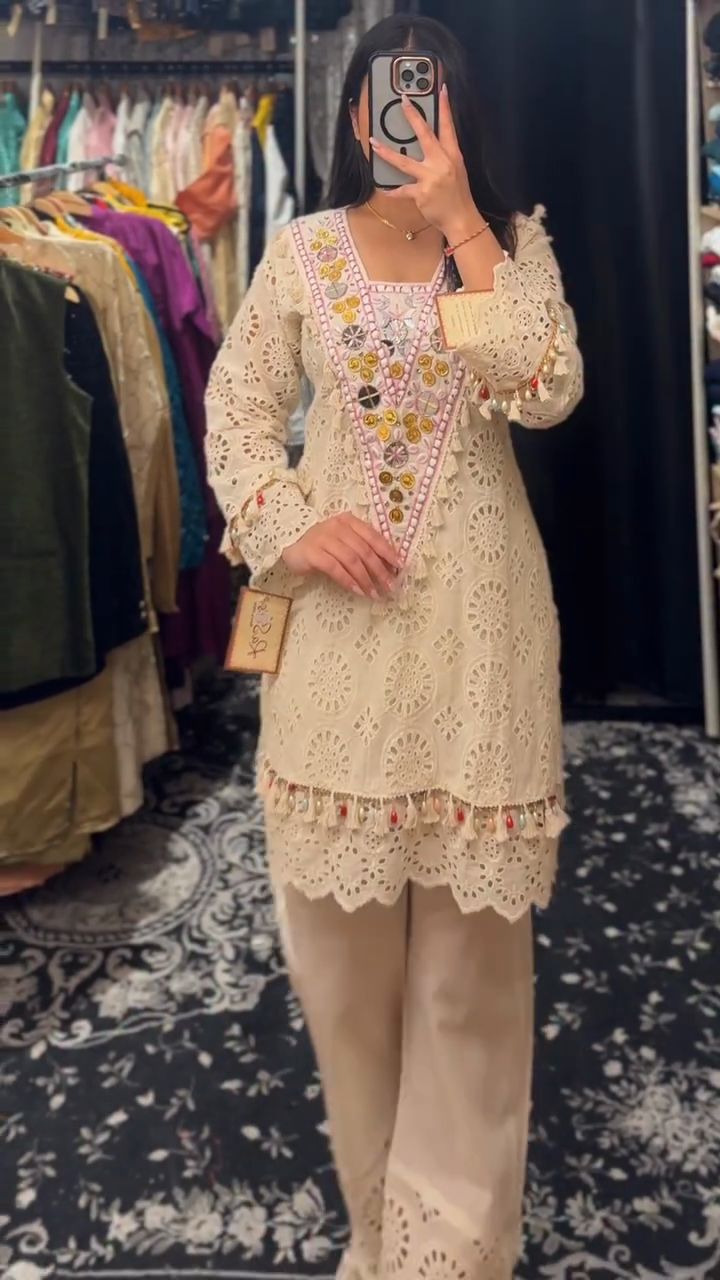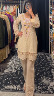 Cream - colored Embroidered Kurta and Pant Set