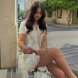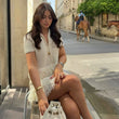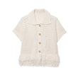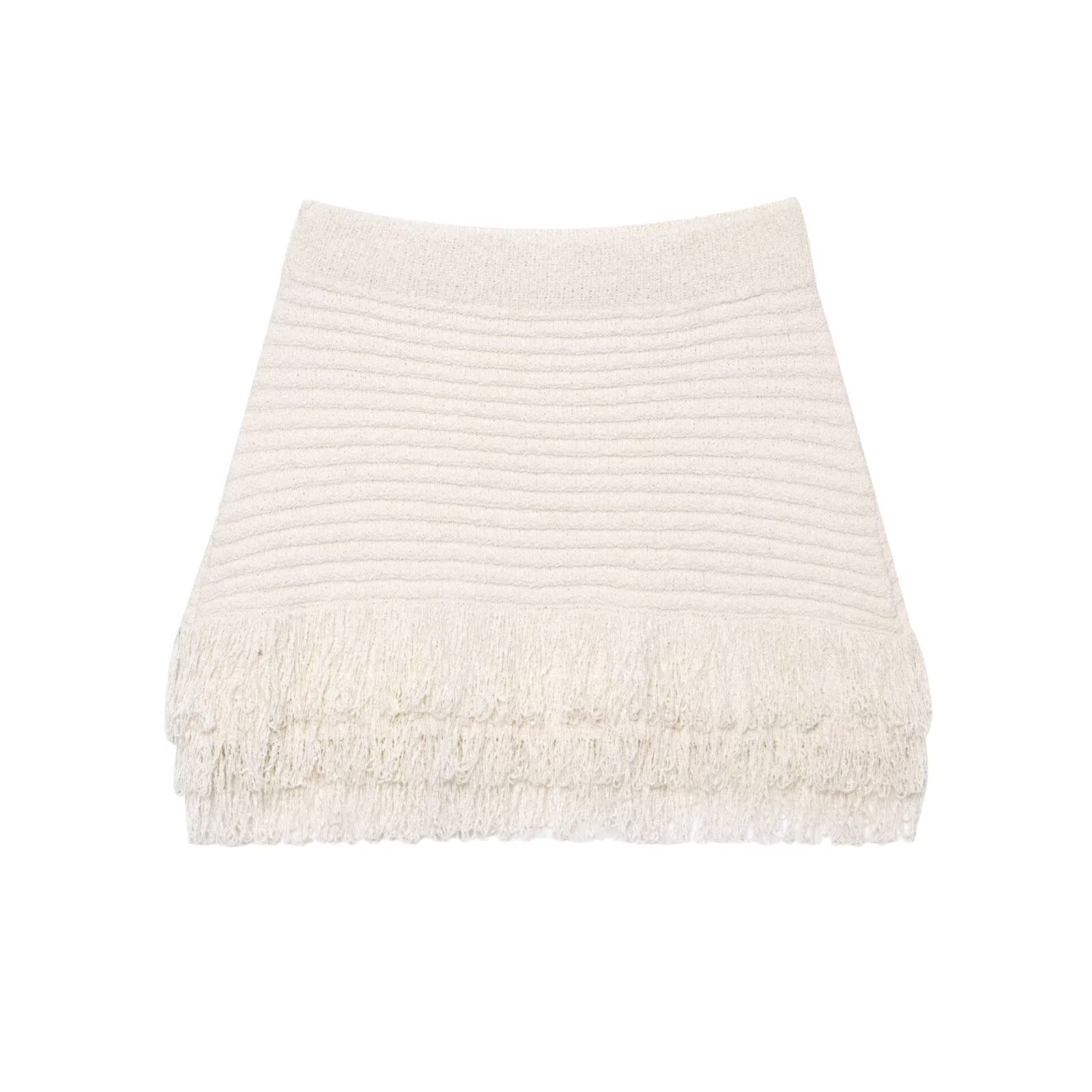 This two-piece set is crafted from soft, comfortable knit for warmth and comfort, making it an ideal transitional piece or casual everyday wear. The top features short sleeves and a low V-neck for a relaxed, streamlined look, while the matching shorts are cut for a relaxed fit, ensuring both comfort and style. Fringe trims at the hem and waistband add a playful, bohemian touch, further enhancing the overall appeal.