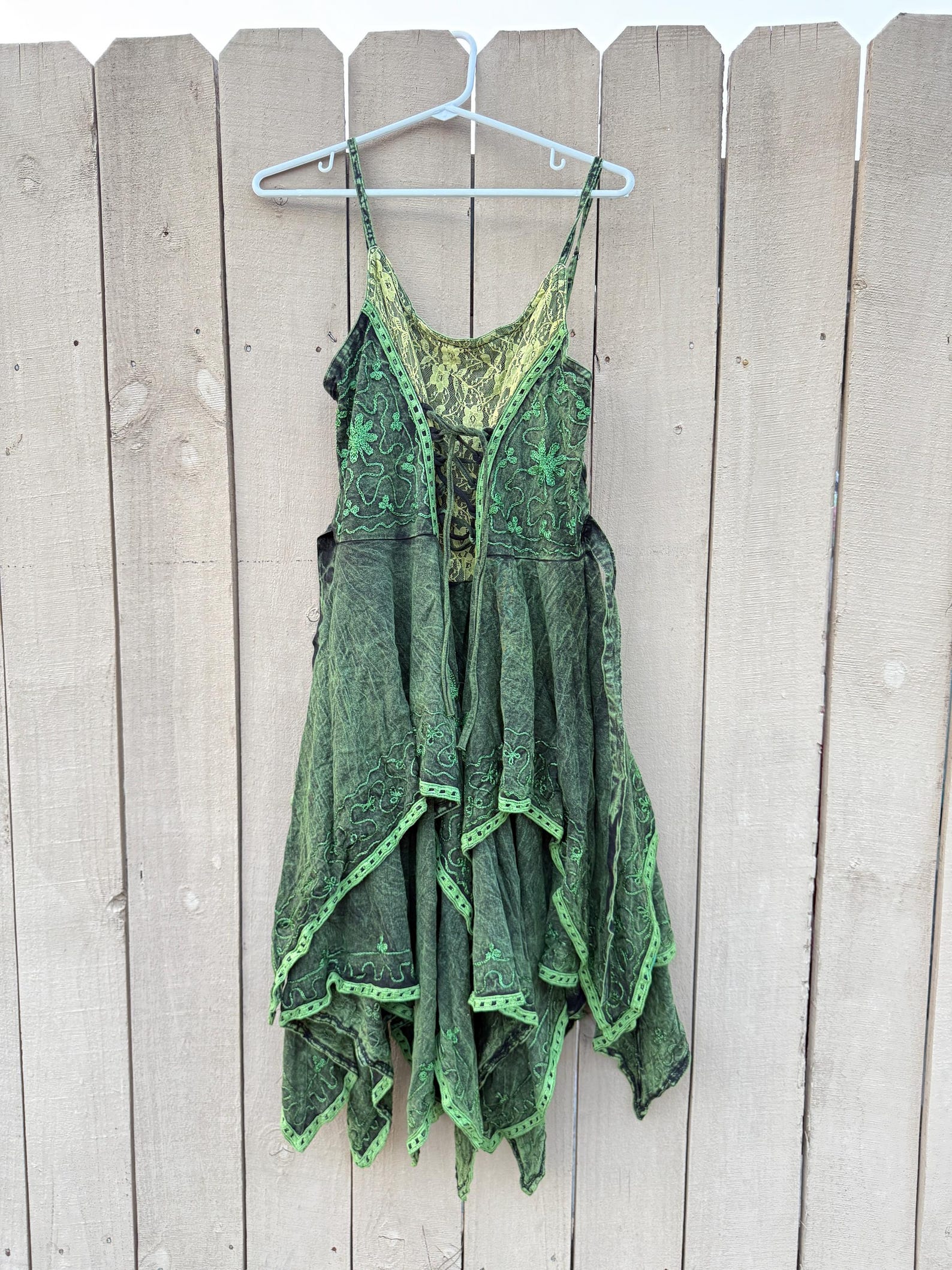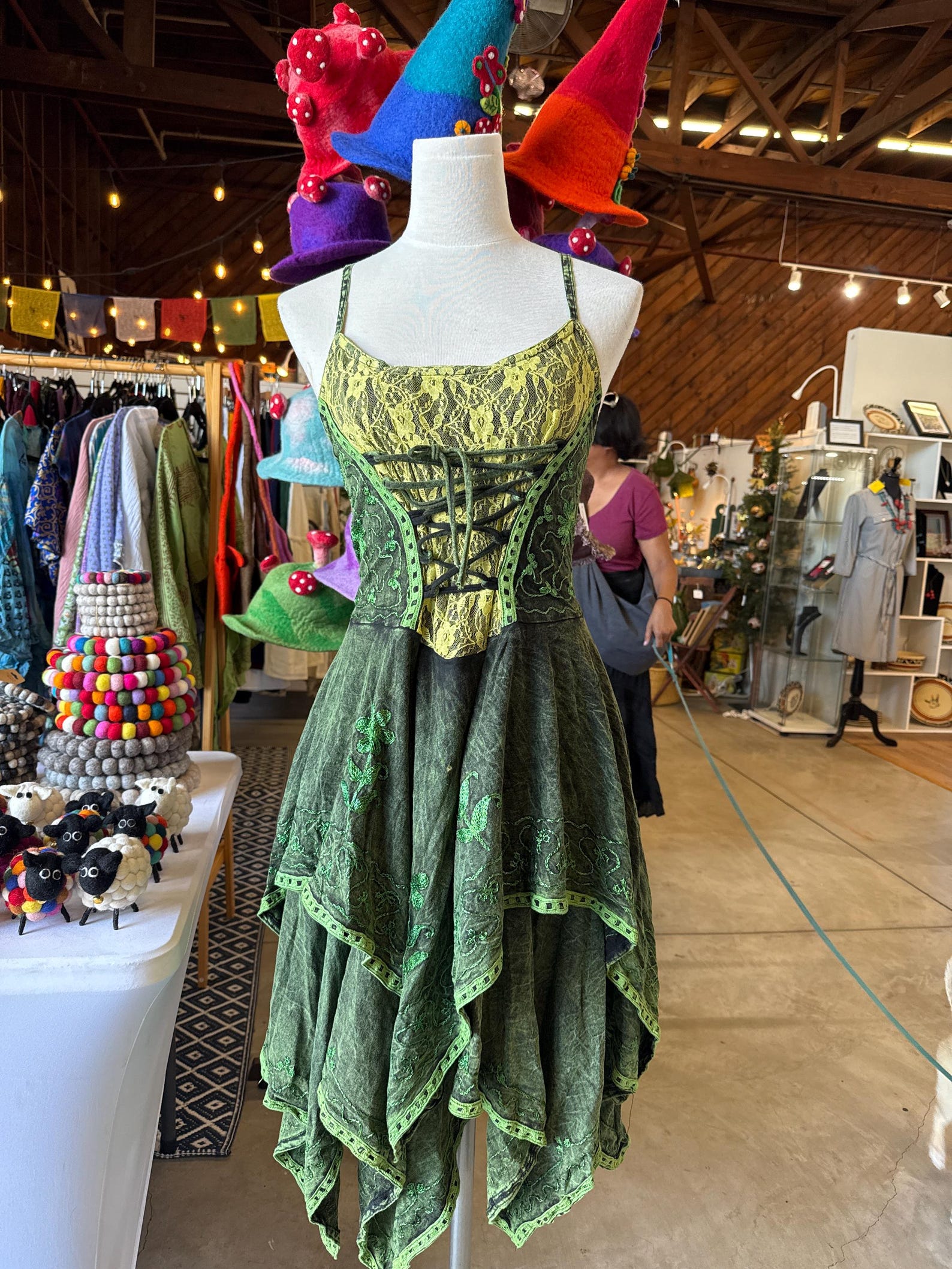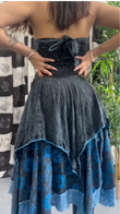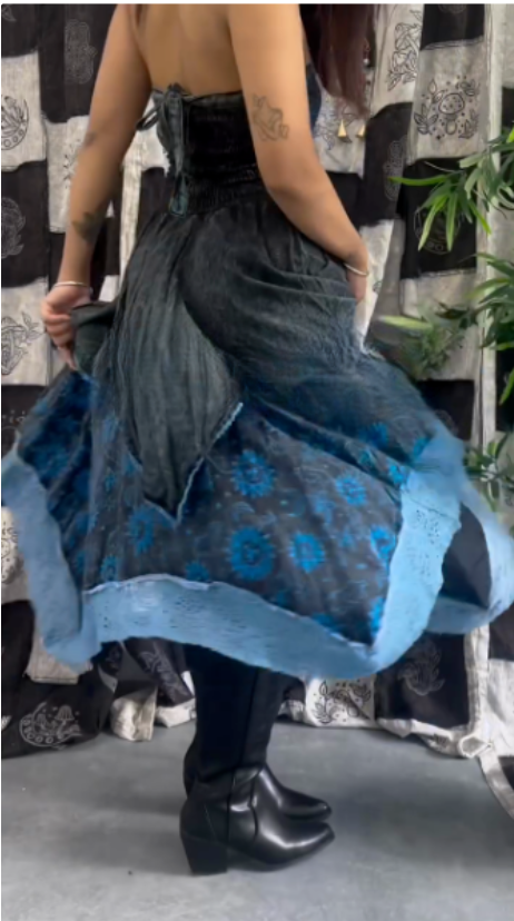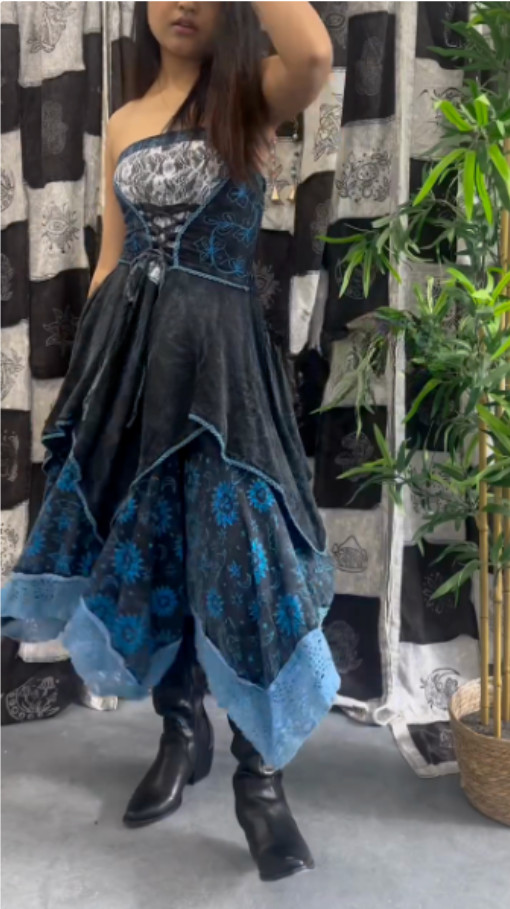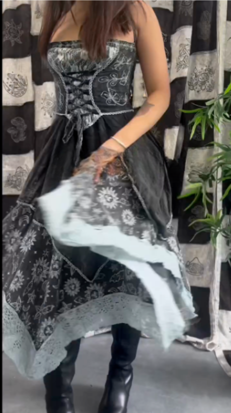 Lace - Up Corset Dress with Celestial Motifsfeaturing a lace - up corset design with floral lace detailing on the bodice. The skirt has a layered, asymmetrical hem and celestial motifs like stars and moons. Accessories include multiple bracelets and rings. This outfit fits a “season of the witch” aesthetic, suitable for themed events, gothic - inspired gatherings, or autumn/winter festivals, exuding a mystical and bohemian vibe.