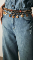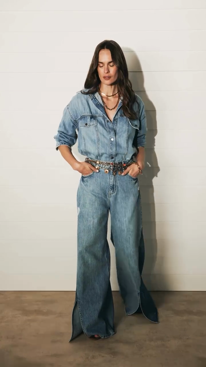Denim Outfit with Embellished Belt and featuring a light blue denim shirt paired with wide - leg denim pants that have side slits. A statement belt adorned with various decorative elements cinches the waist, adding a touch of flair. The outfit is complemented by layered necklaces and simple earrings. This look offers a modern take on double - denim, suitable for casual outings or stylish everyday wear.