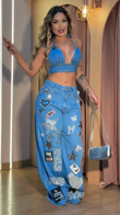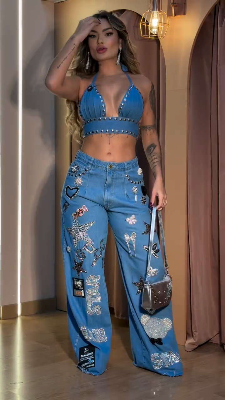 Denim Suspender Top and Embellished Wide-Leg Pants Set