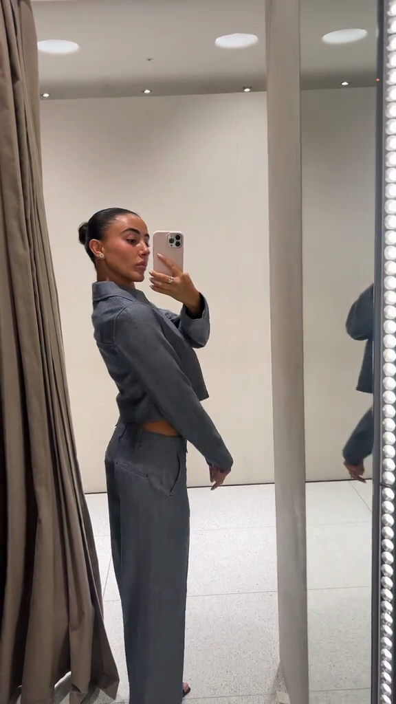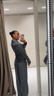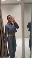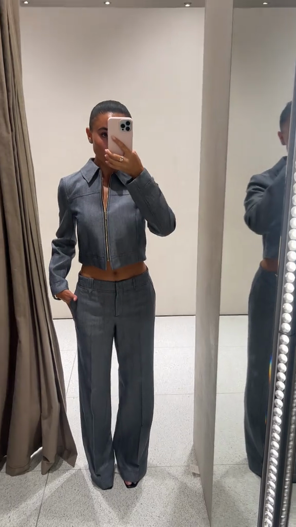 The person is wearing a two - piece denim outfit consisting of a cropped, zippered denim jacket and high - waisted, wide - leg denim pants. The outfit is complemented by black open - toe shoes. This ensemble has a sleek and modern look, suitable for casual outings or stylish everyday wear.