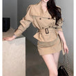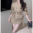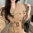 This beige trench coat features a classic double-breasted design, accented with eye-catching buttons for an elegant touch. Wide lapels and sculpted shoulders give it a refined, traditional look. A detachable belt with a rectangular buckle at the waist provides a comfortable fit and enhances the silhouette. This trench coat combines style and practicality, embodying refined elegance. It's an ideal choice for everyday office wear, casual outings, or semi-formal occasions. As shown, it's paired perfectly with a stylish chain shoulder bag for an added touch of luxury. Pair it with a dress, pants, or other separates for a stylish and sophisticated look.