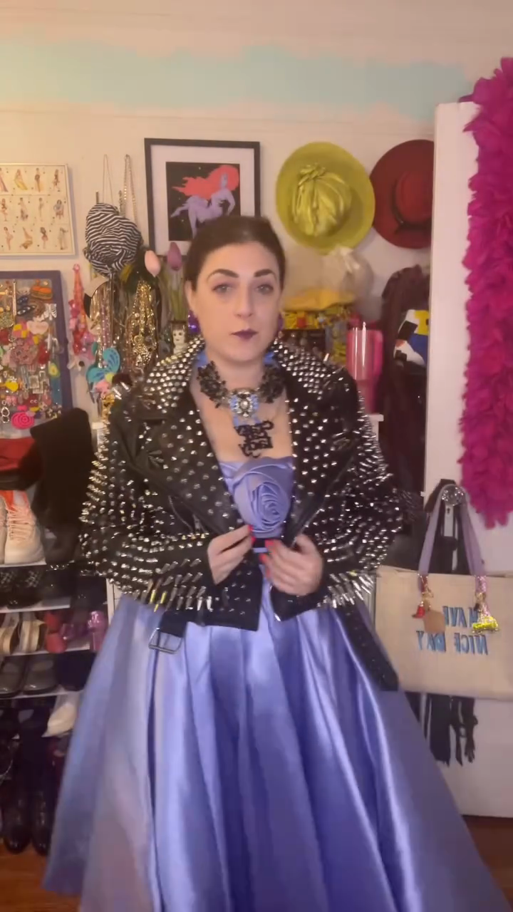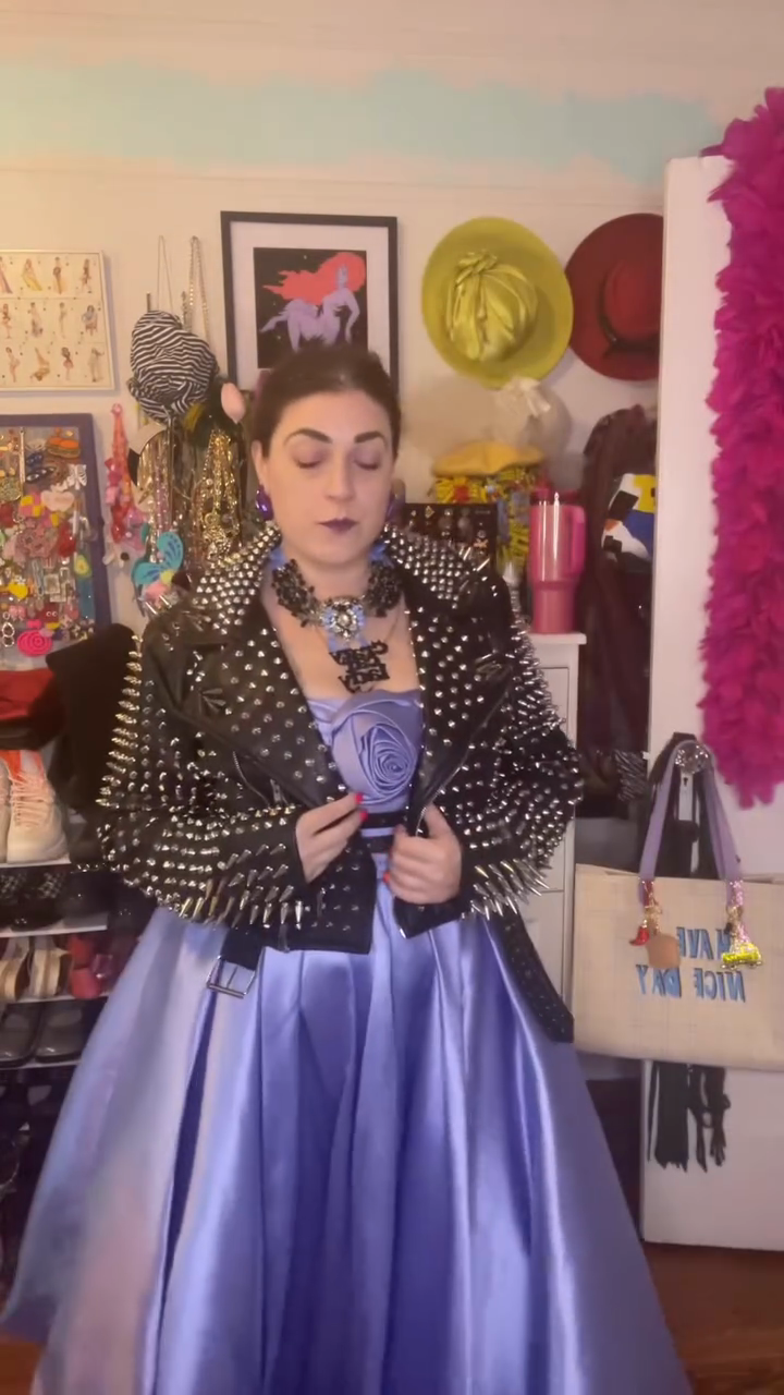This black leather jacket features a bold, edgy silhouette, accented with studs for a rebellious edge. The studs shimmer in the light, adding a pop of color and making the jacket stand out. Easily paired with a bold purple dress like the one pictured, or with casual jeans and a T-shirt, its rugged yet stylish style instantly elevates any outfit, perfect for those looking to express their individuality with a touch of eccentricity.