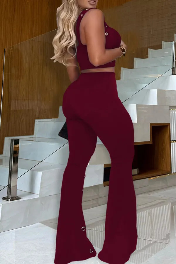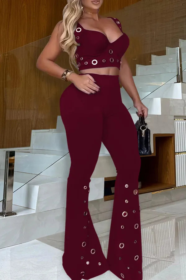 Make a bold fashion statement with this striking two - piece set. The crop top features a supportive bra - style design, adorned with gold - toned ring embellishments that add an edgy and glamorous touch. Paired with high - waisted flared pants, which are also decorated with an array of gold rings, especially concentrated towards the flared hems. This set is perfect for a night out at a trendy club, a fashion - forward party, or a special event where you want to stand out.